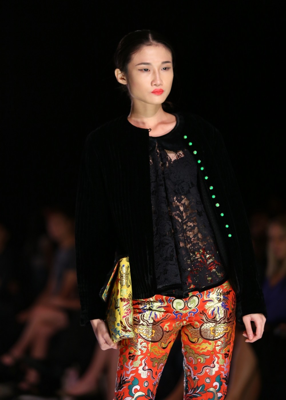 | Những chiếc quần gấm nổi bật hơn nhờ họa tiết truyền thống. Phối cùng áo ren tối màu phá cách. |