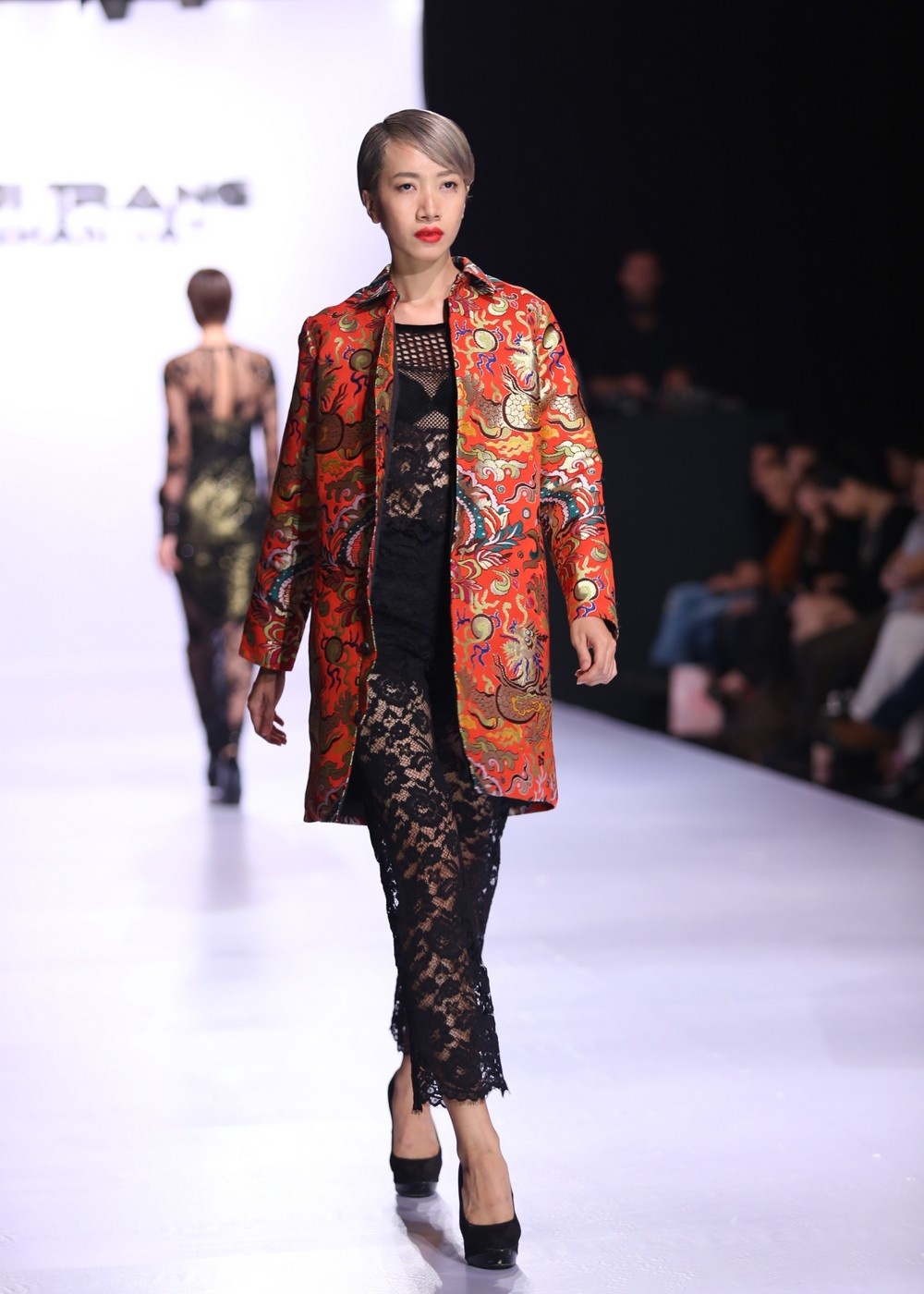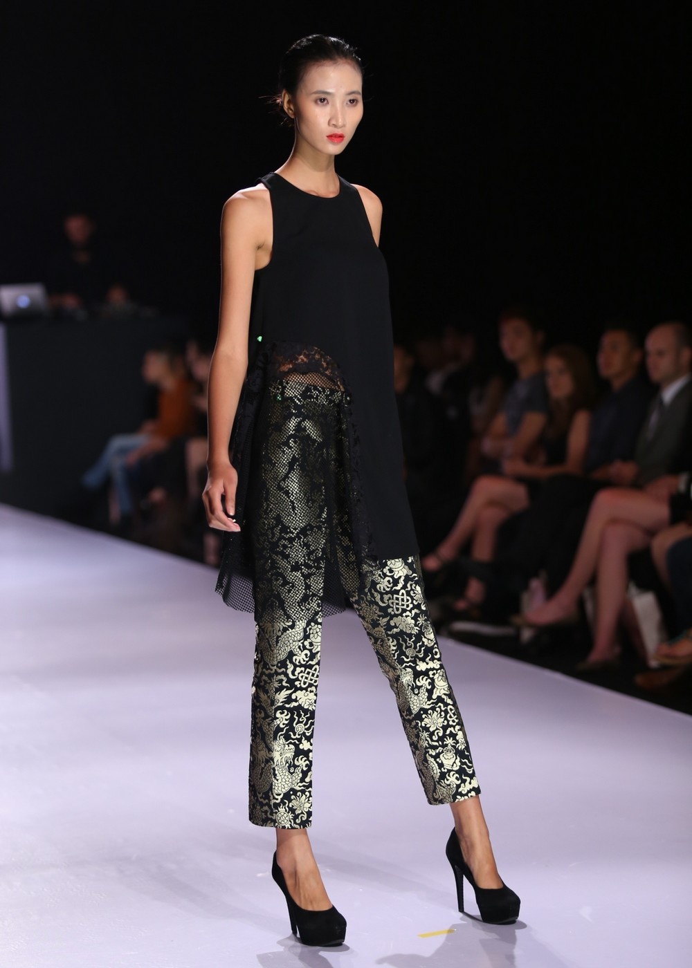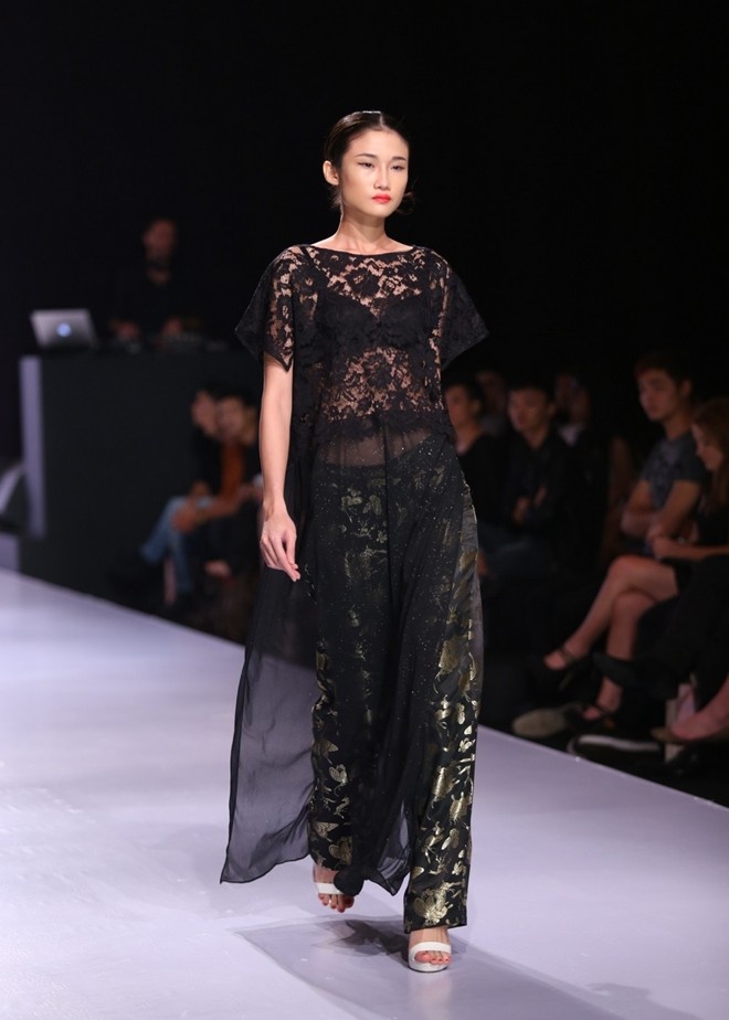 | Chân dài Nguyễn Thị Thanh nổi bật trên sàn diễn với thiết kế áo voan mỏng mix cùng quần vải gấm. |