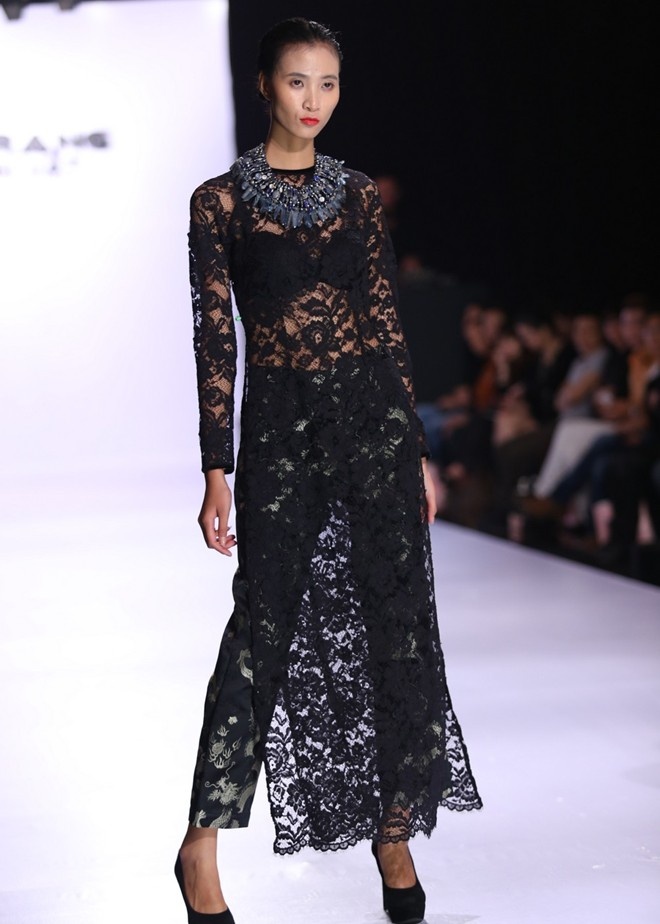 | Tham gia chương trình Thời trang & Nhân vật số tháng 9, NTK Thủy Nguyễn giới thiệu BST đa dạng về kiểu cách. Bên cạnh chủ đề chính là áo truyền thống gấm lụa, Thủy Design House còn giới thiệu những mẫu áo dài ren voan xuyên thấu gợi cảm. BST tạo điểm nhấn với những thiết kế váy ngủ phù hợp với xu hướng đang thịnh hành. Trong ảnh, Kha Mỹ Vân thể hiện mẫu áo dài ren kết hợp voan, quần vải lụa gấm. Chất vải mỏng khiến người mặc để lộ nội y khi trình diễn. |