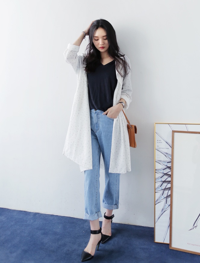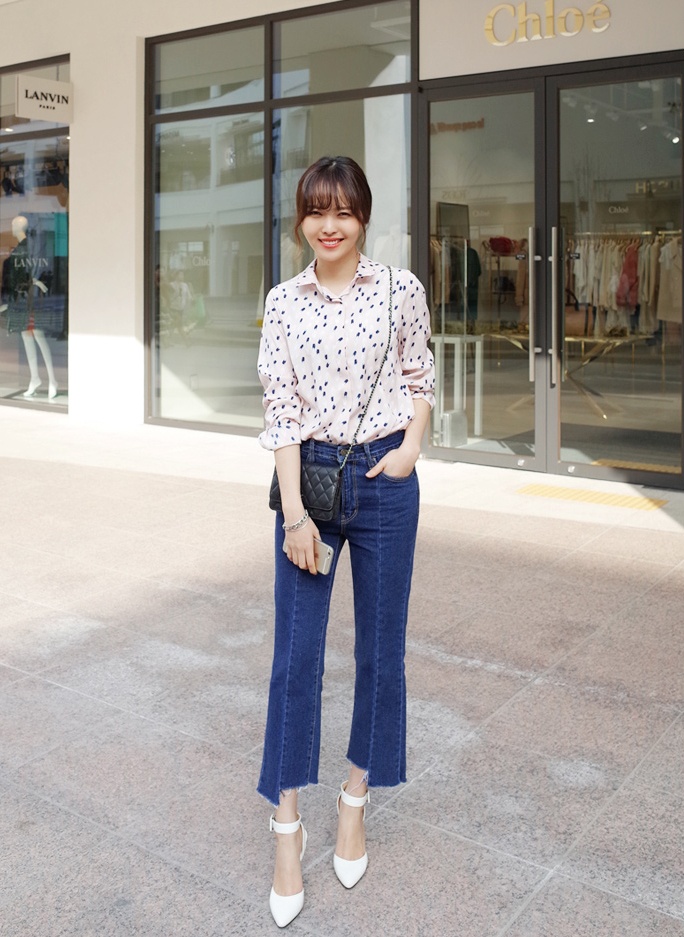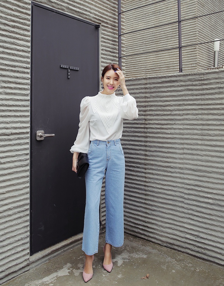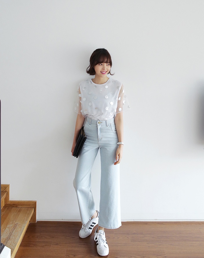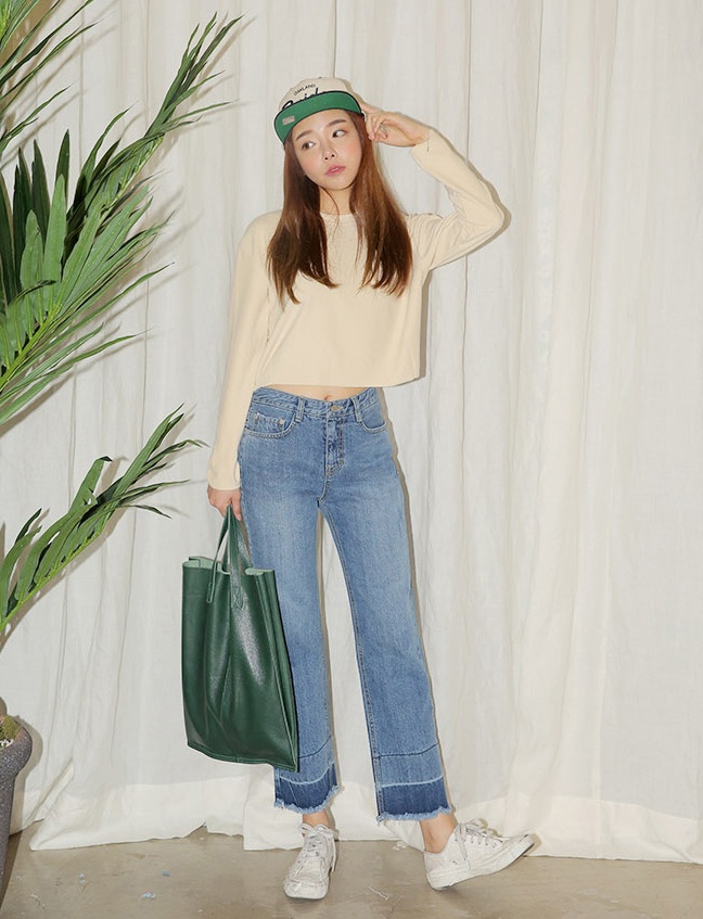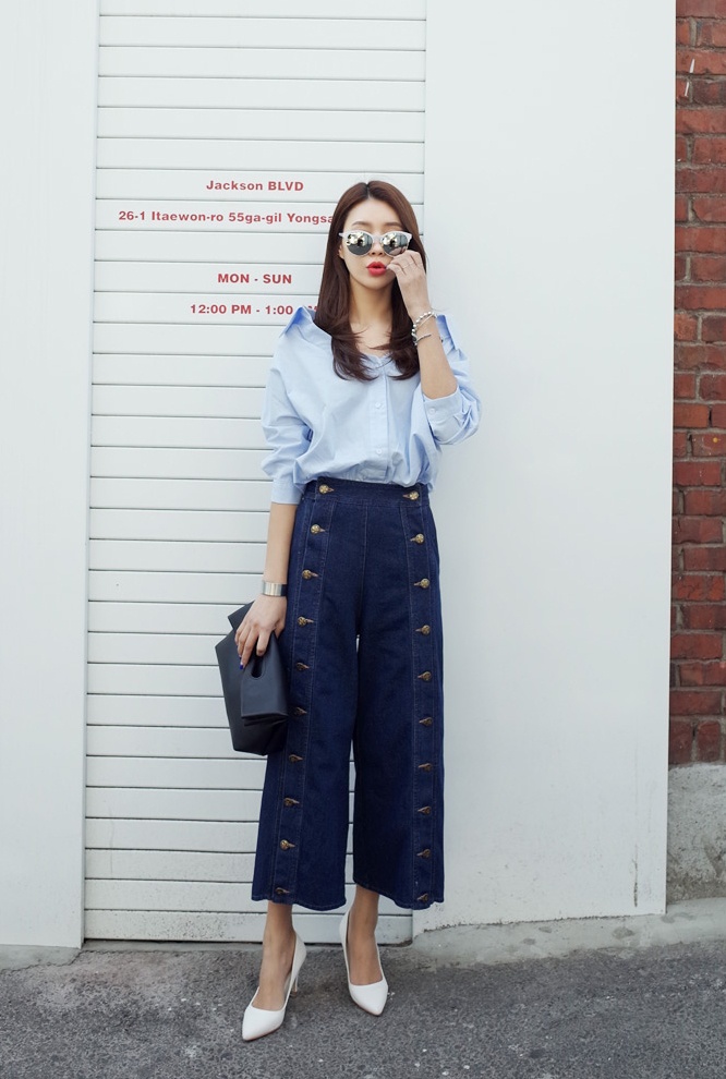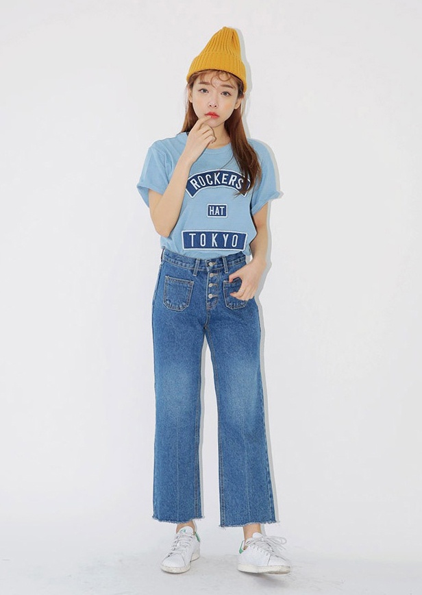 | Cách kết hợp trẻ trung của quần jeans ống rộng với hàng nẹp cúc đẹp mắt. |