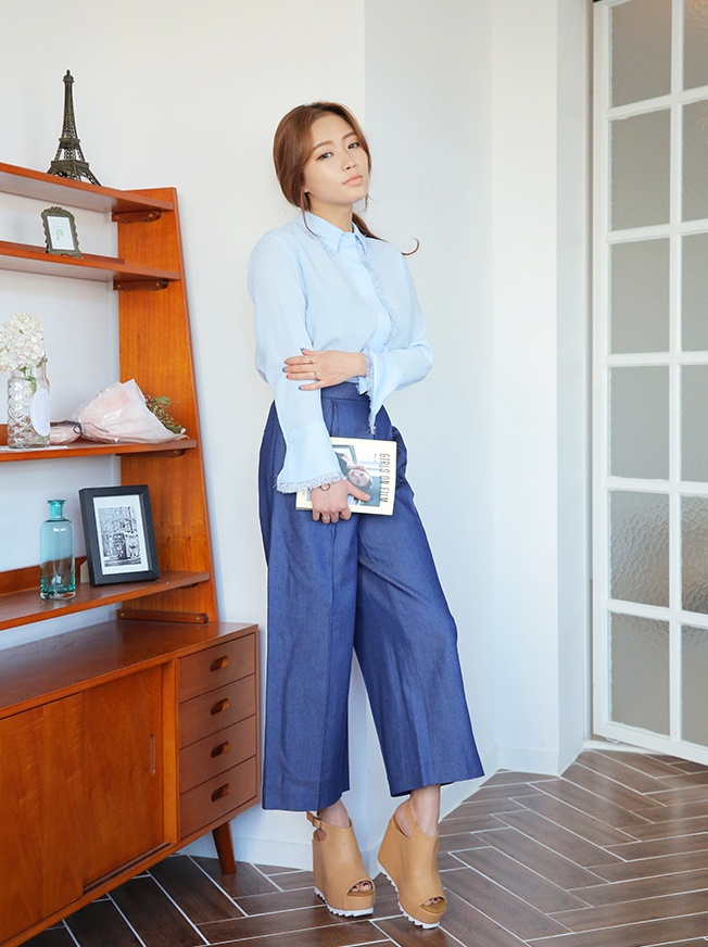 | Mốt quần jeans ống rộng không có nhiều sự khác biệt với mốt quần culottes đang làm mưa làm gió trên các diễn đàn thời trang. Tuy nhiên nhờ chất liệu vải dày dặn nên chiếc quần này dễ tạo phom dáng hơn. Với trang phục đi làm, bạn có thể mix kèm sơ mi cổ điển đẹp mắt. |