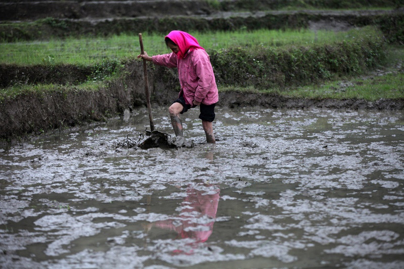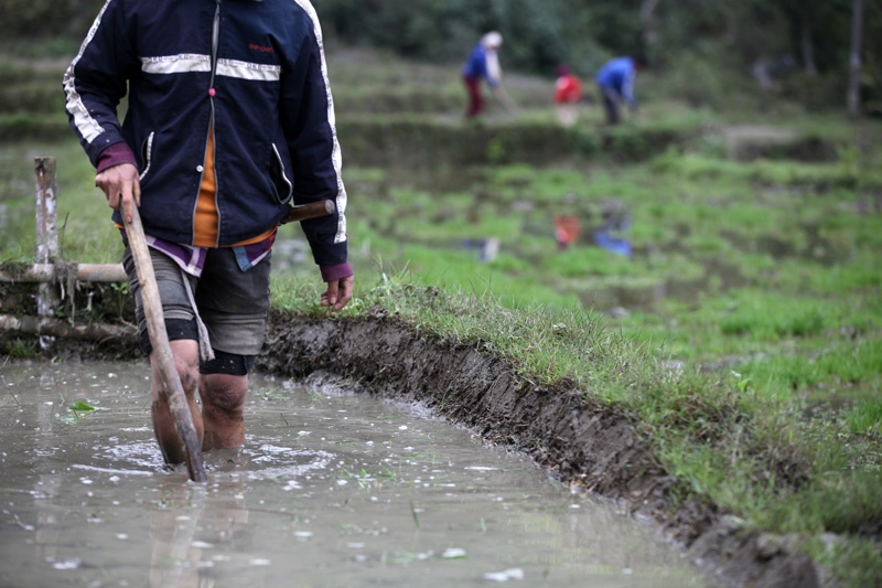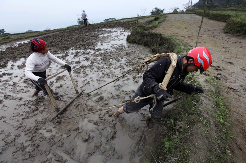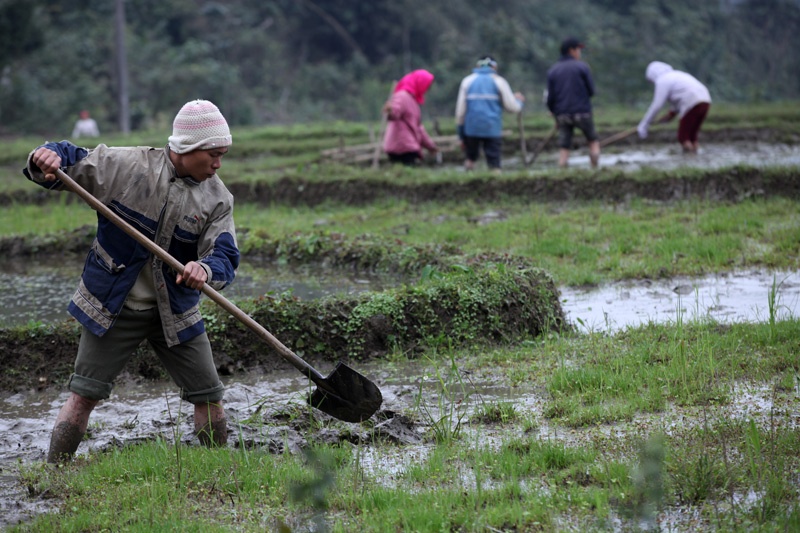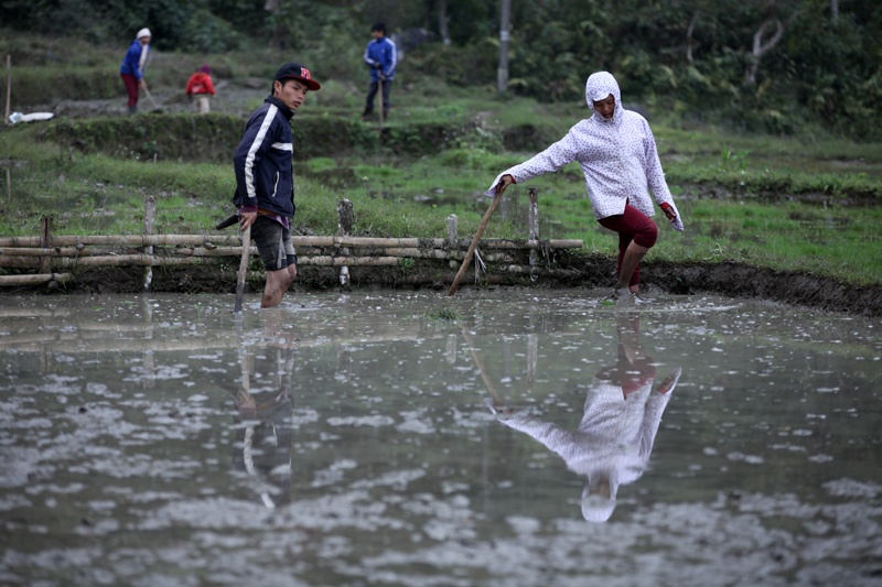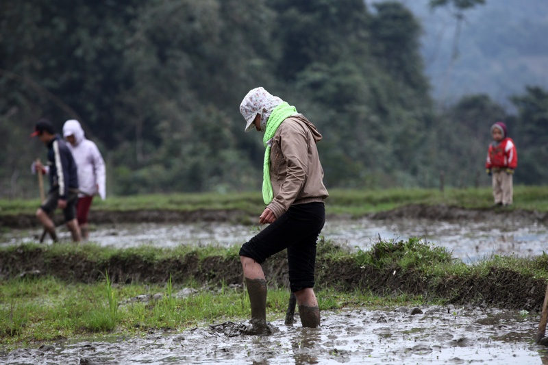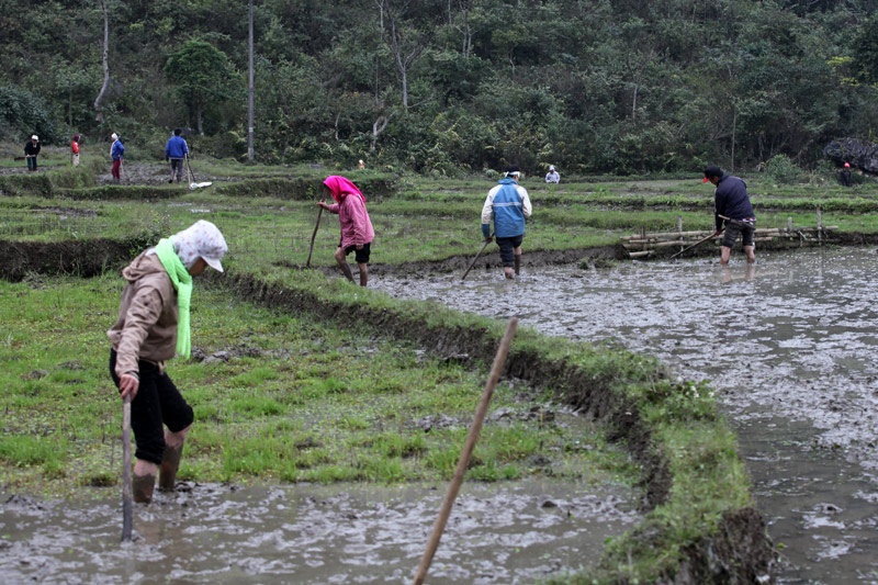 | Mảnh ruộng nhỏ nên khó thuê cày, bừa máy và cũng để tiết kiệm những nông dân người Mường thường làm ải đất bằng chính đôi chân của mình. |