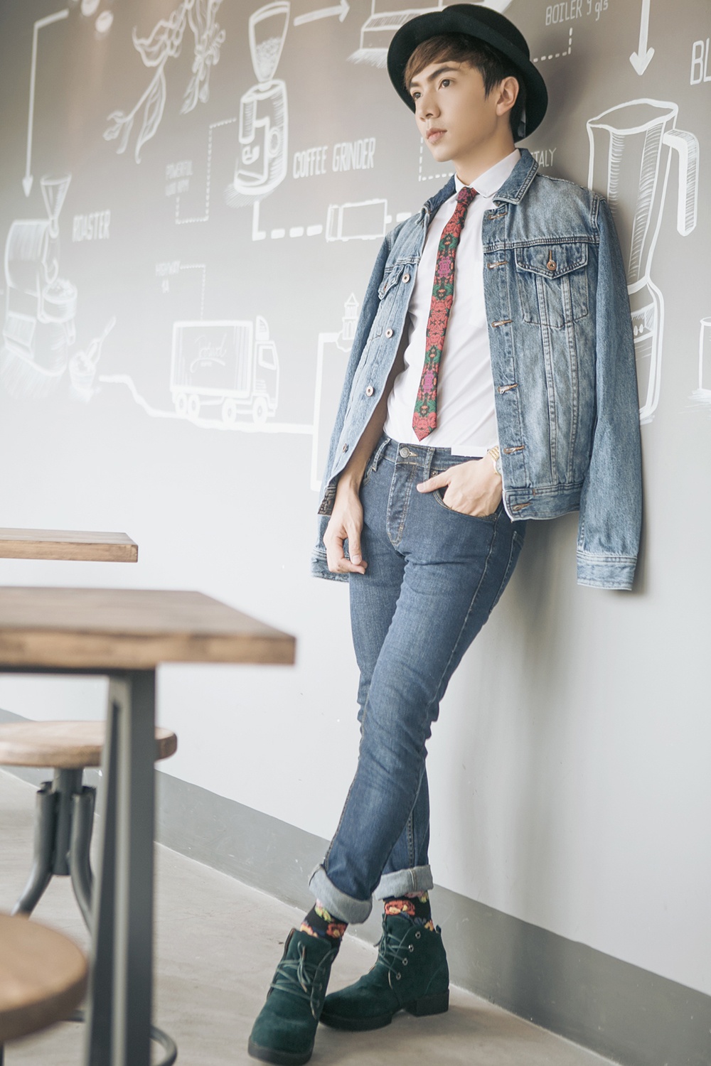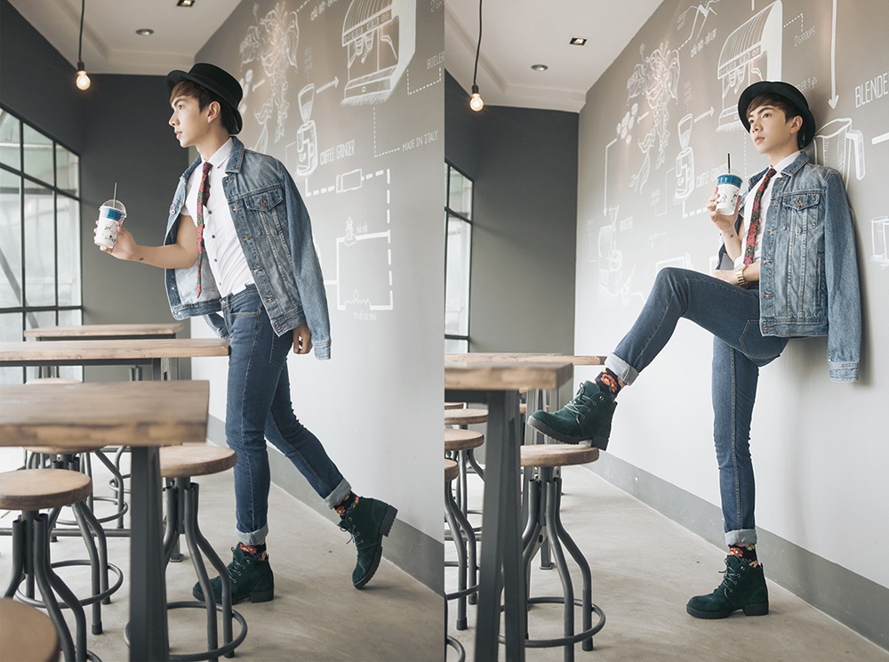 | Xu hướng denim on denim đang là mốt, cách của stylist làm mới xu hướng này là điểm nhấn màu đến từ Caravat, tất in họa tiết của Top Man gam màu tươi. |