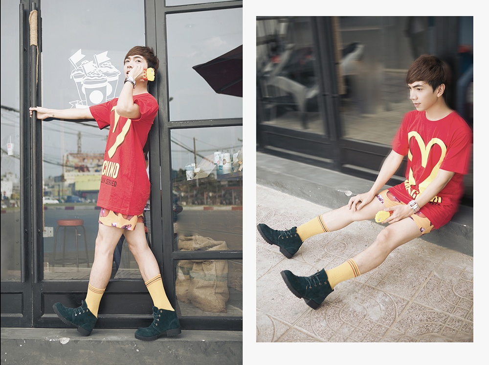 | Stylist Ti Ak khéo léo mix áo T shirt đỏ tươi với quần short tông vàng in họa tiết trái cây của Hà Nhật Tiến, tất vàng cùng tông kết hợp với giày cực năng động. |