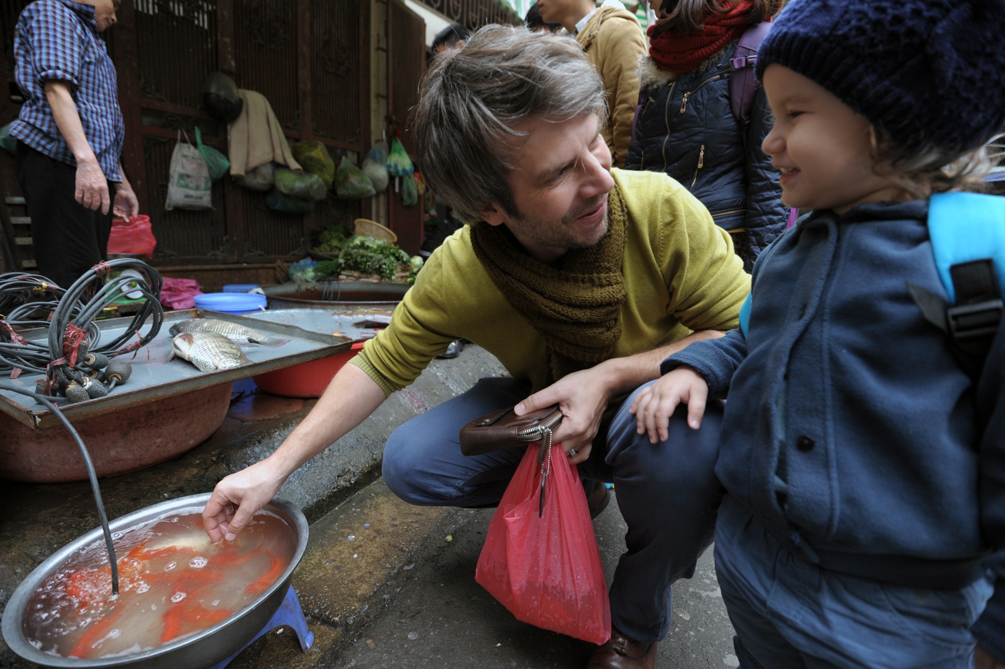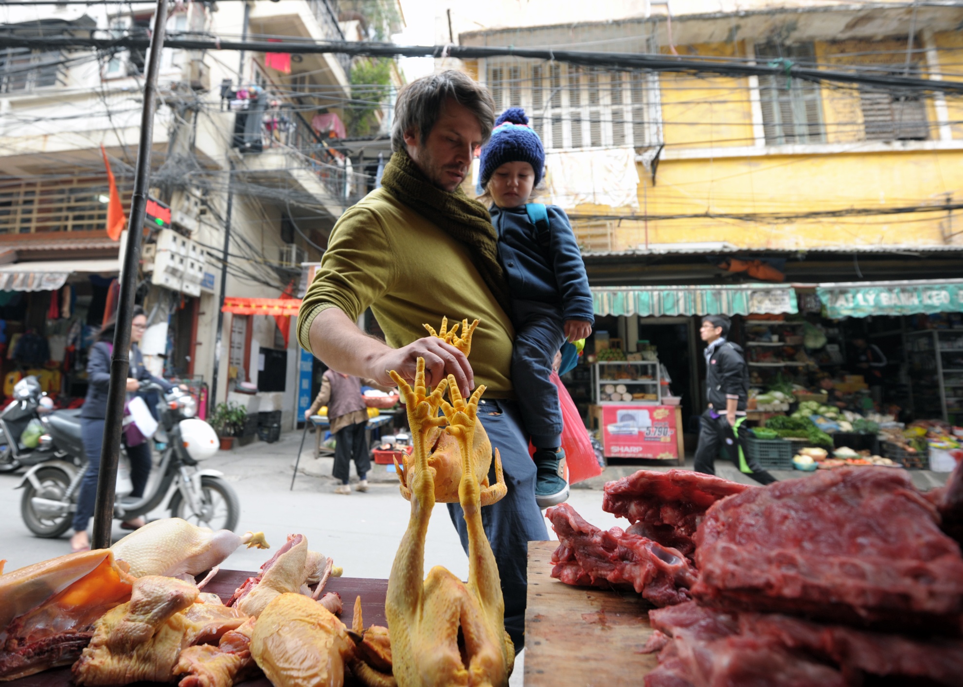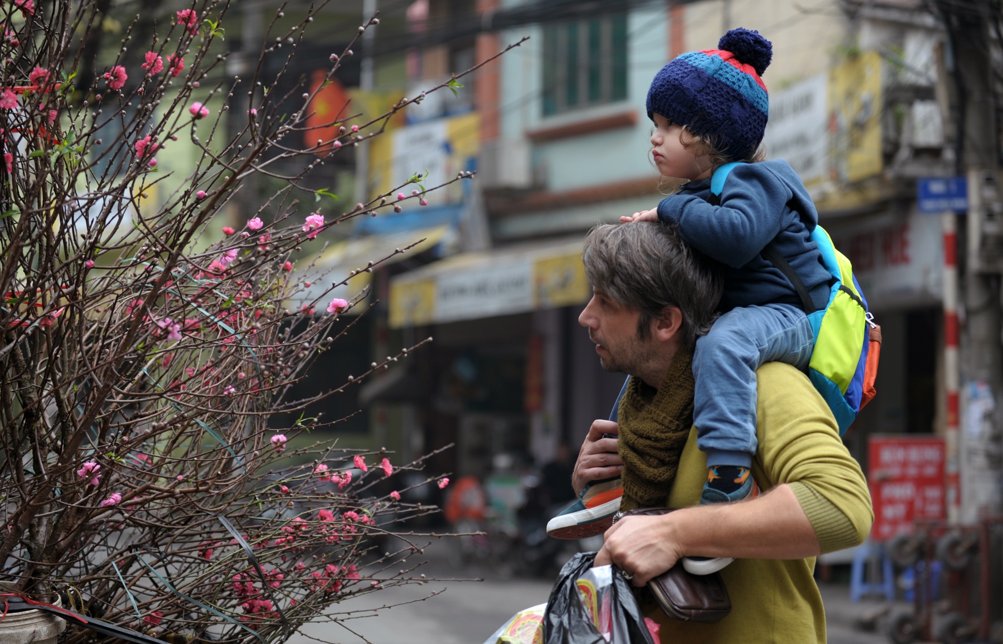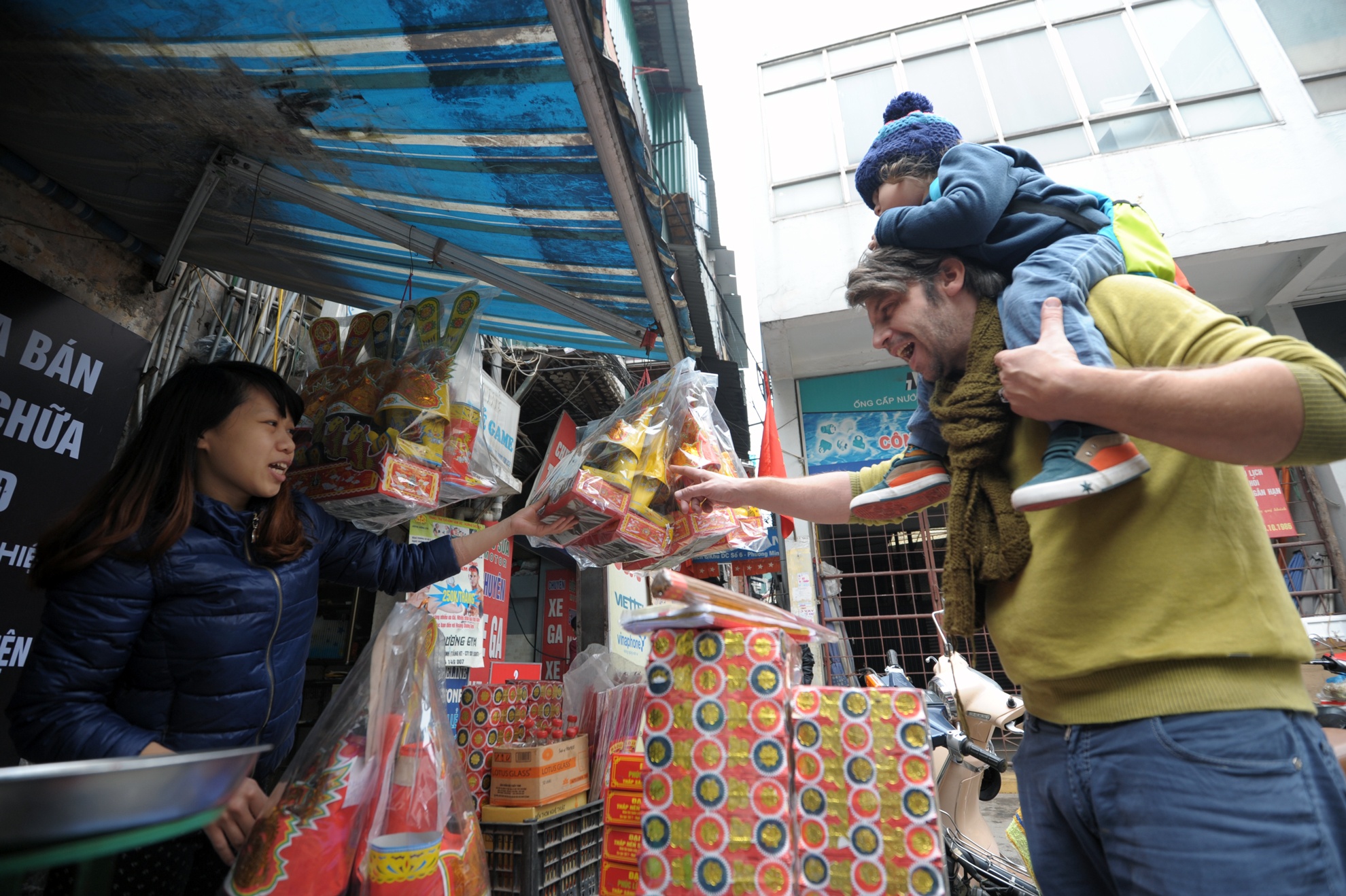 Anh Torsten Illagen cùng con trai tranh thủ ngày nghỉ đi chợ mua sắm đồ lễ, làm cơm cúng và thả cá chép tiễn Táo quân chầu trời theo phong tục người Việt Nam.