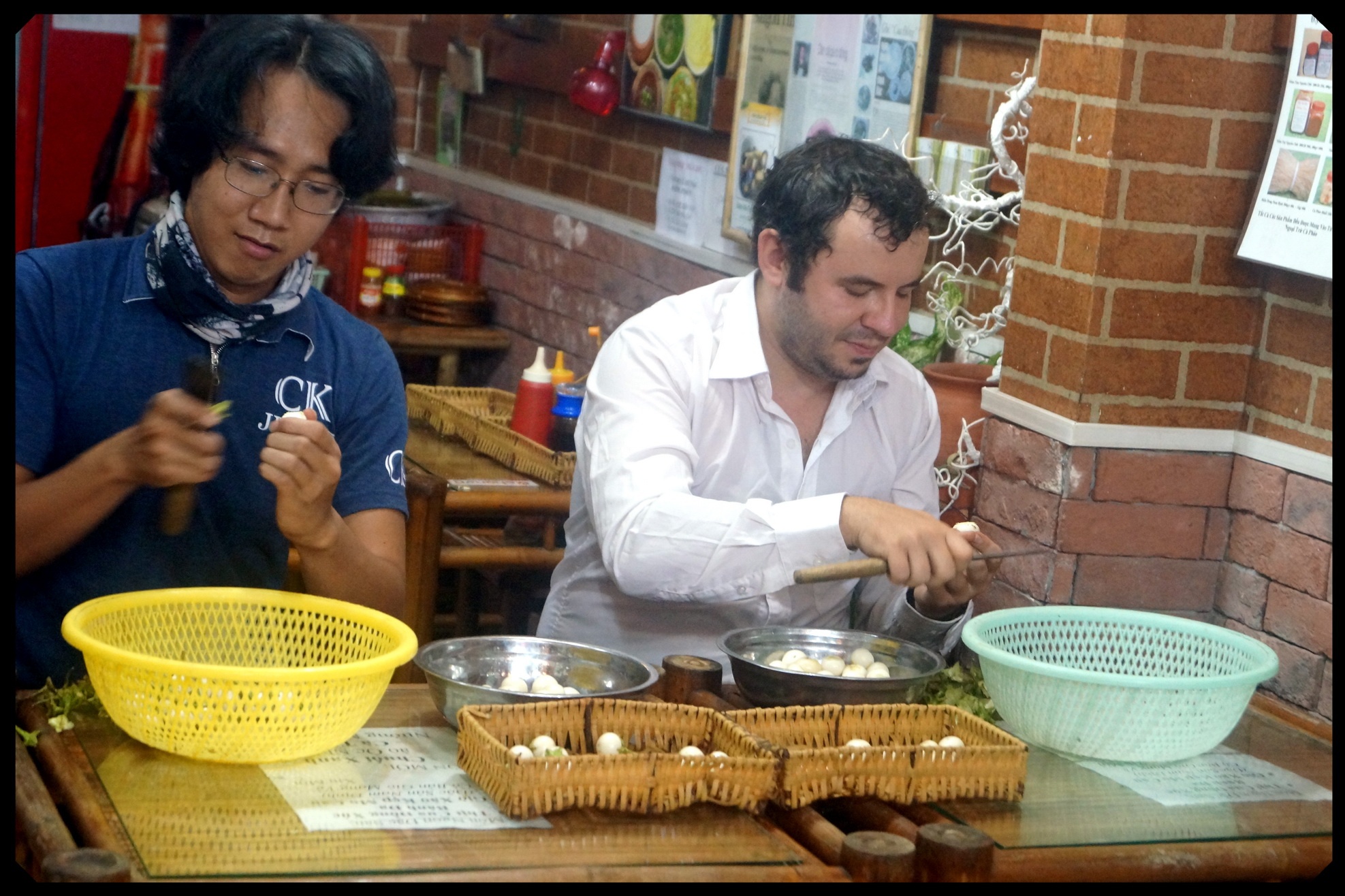 Sau đó hai chàng được trổ tài khéo léo khi nhồi thịt cua - một trò chơi đòi hỏi sự khéo léo nhưng vẫn đòi hỏi tốc độ.