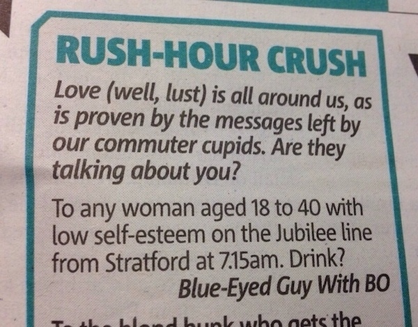 Gửi đến bất kỳ cô gái nào trong độ tuổi 18-40 với tiêu chuẩn thấp, ở trên đường Jubilee từ Straford (một đường ngầm ở London, Anh) lúc 7h15. Em có muốn uống một chút không?