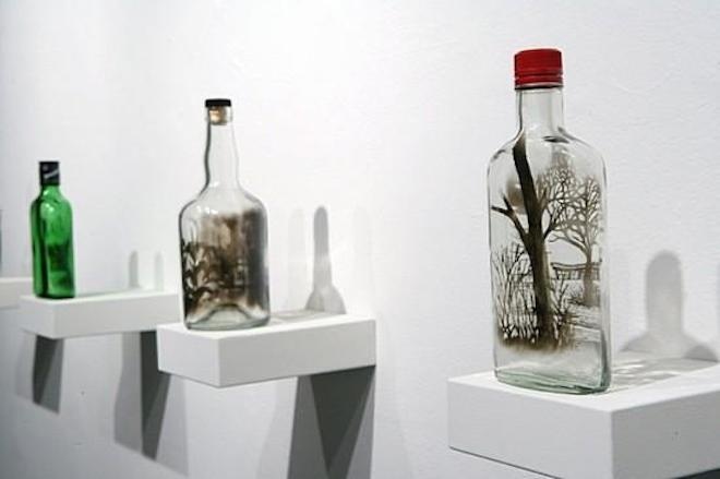 | Sáng tạo bên trong miệng chai nhỏ không hề đơn giản, vì vậy Jim đã phải tạo màu nền trước bằng khói nến, sau đó dùng đến bàn chải nhỏ, tăm bông, kim... vẽ các chi tiết. Công đoạn này đòi hỏi sự tỉ mẩn, khéo léo cao. |