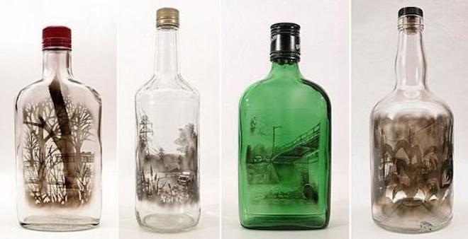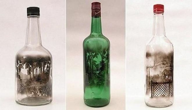 Chàng trai dùng khói nến vẽ tranh trong chai rượu