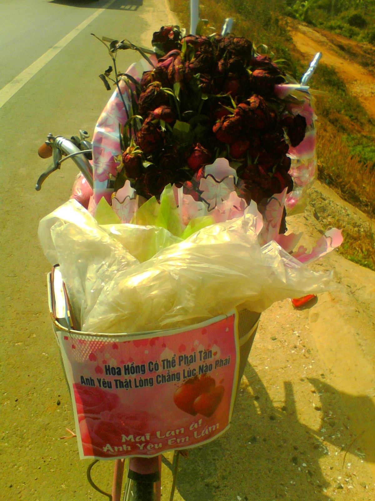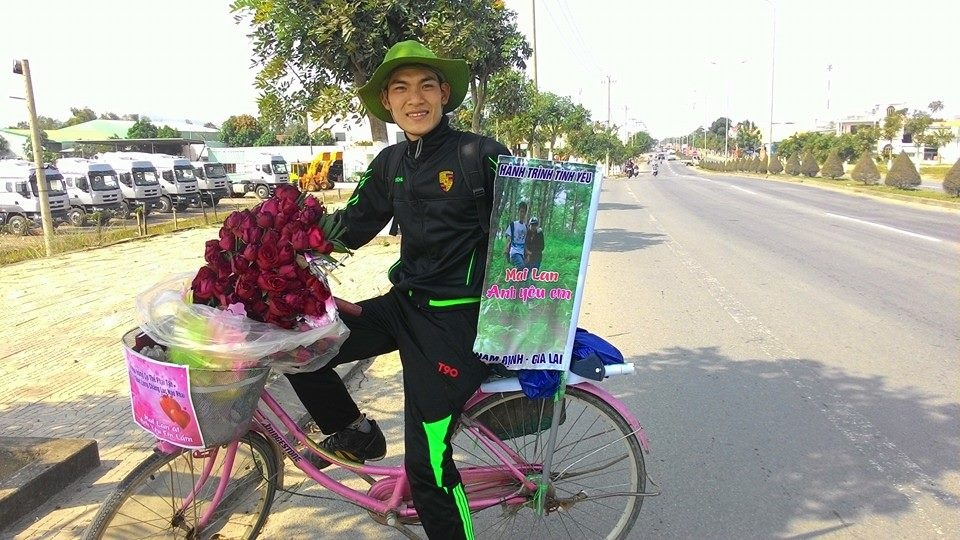| Thăng và chiếc xe đạp, các tấm băng rôn tỏ tình trong chặng đường tặng quà cho bạn gái. Thăng là cựu sinh viên khoa Văn hóa học tại ĐH Đà Lạt. Mai Lan là sinh viên khóa sau, học ngành Lịch sử. Hình ảnh do một thành viên tại Quảng Nam ghi lại. |