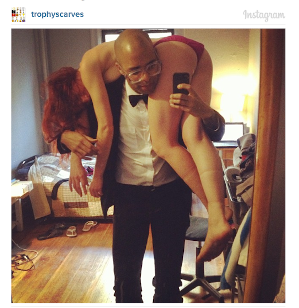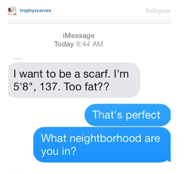 Nhiếp ảnh gia Nate Hill với tài khoản mang tên Trophy Scarves trên Instagram thường xuyên đăng tải những bức hình vô cùng kì lạ. Theo đó anh luôn vắt một cô gái trẻ lên người thay cho… khăn quàng cổ và ghi lại khoảnh khắc đặc biệt này.