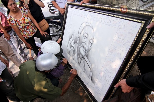 Sáng nay, trong dòng người tập trung ở 30 Hoàng Diệu để tưởng nhớ Đại Tướng, có một cựu sinh viên trường Xây dựng tên Nguyễn Gia Hiếu đã vẽ bức tranh khổ A0 chân dung tướng Giáp trong vòng 5 tiếng đêm qua với mục đích để mọi người lưu lại chữ ký và những dòng tri ân tới Đại tướng trên bức tranh.
