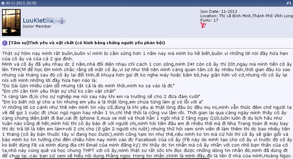 Chàng trai có nickname LuuKiet… kể về trường hợp của mình với tâm trạng chua xót: “Thật sự hôm nay mình rất buồn, buồn vì mình bị "cắm sừng" hơn một năm nay mà mình không hề biết, buồn vì những lời nói đầy hứa hẹn của cô ấy và của cả hai gia đình.