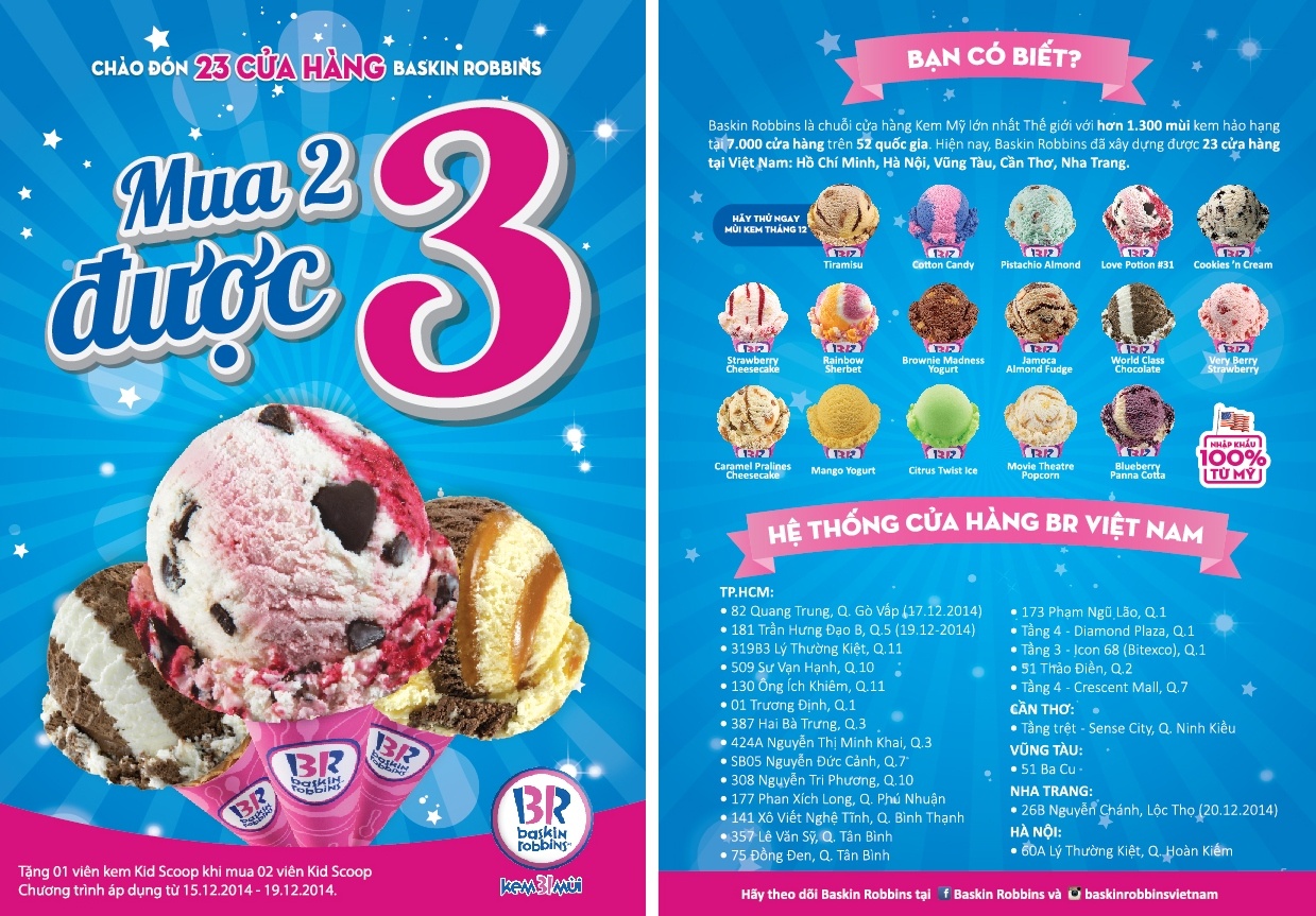 Hiện tại kem Baskin Robbins đã có cửa hàng ở các thành phố lớn như TP.HCM, Hà Nội, Vũng Tàu, Cần Thơ, Nha Trang. Để kỷ niệm dịp khai trương cửa hàng thứ 23, thương hiệu này mang đến chương trình ưu đãi hấp dẫn “Mua 2 được 3”, từ ngày 15/12 đến 19/12.