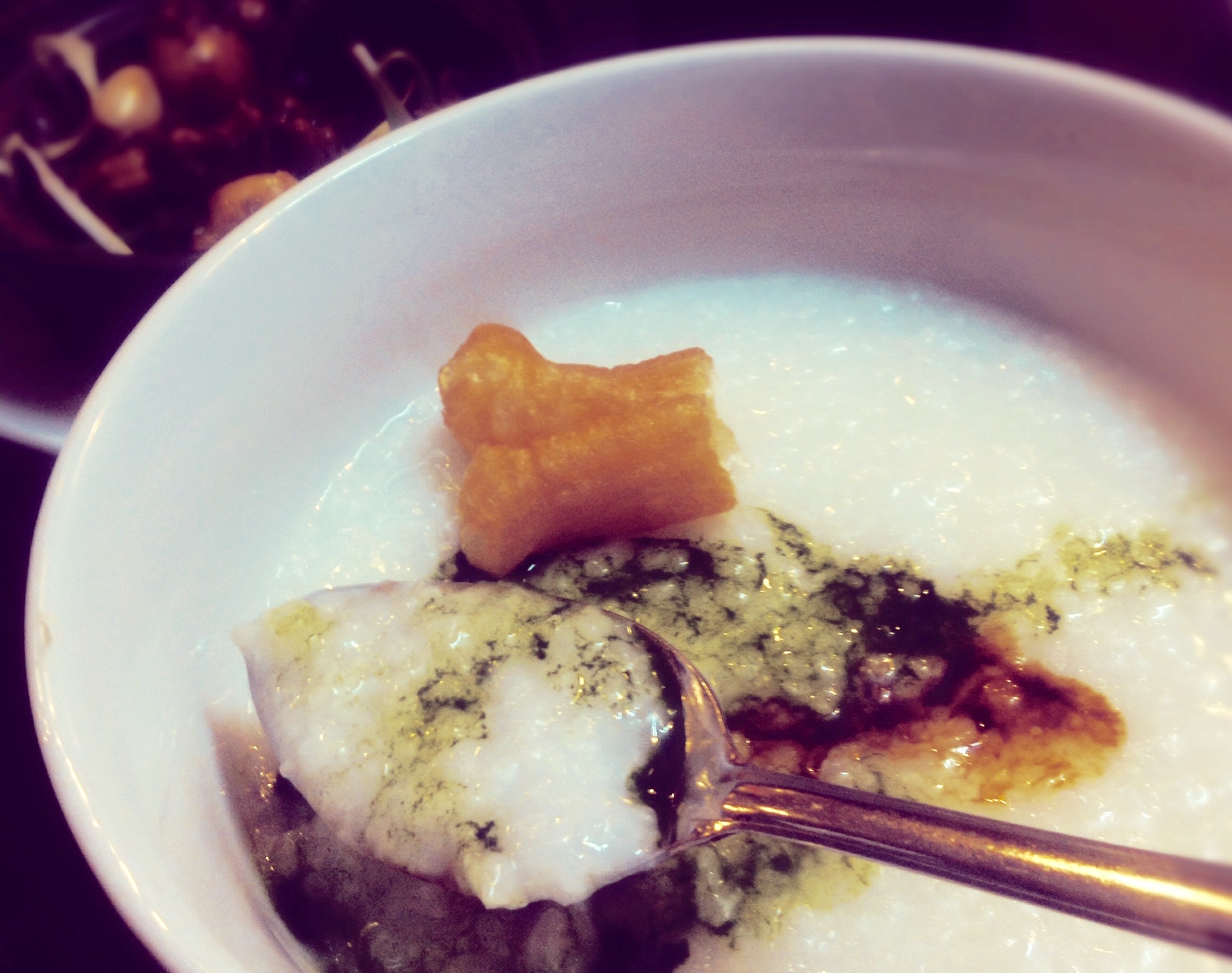 Bát cháo được để riêng bên ngoài. Cháo nấu theo kiểu để nguyên hạt, đặc sệt và không quá nóng. Nếu chọn hương lá dứa, bạn sẽ thấy có ít nước cốt lá dứa màu xanh trên bề mặt.