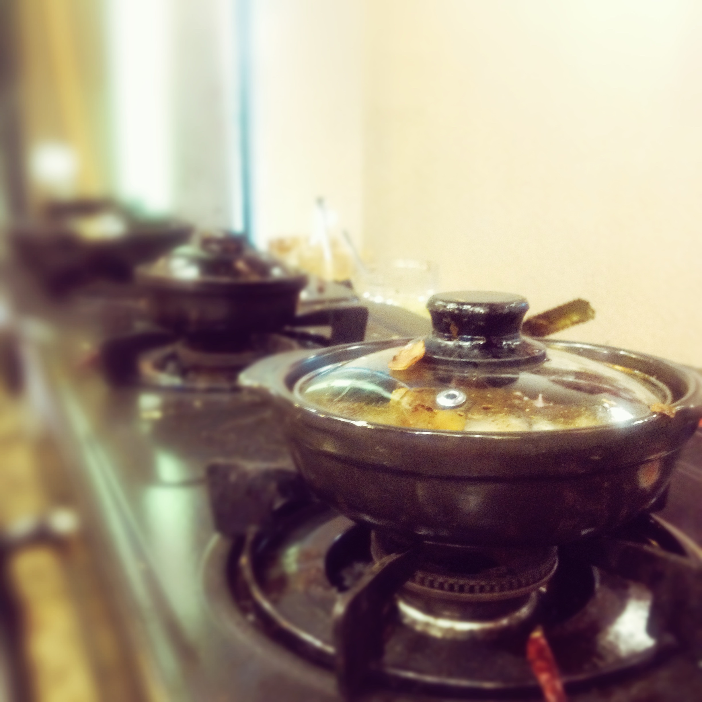 Trước cửa tiệm là dàn niêu ếch để sẵn trên bếp ga. Thực đơn đơn giản, chỉ cháo và ếch, thêm hai món phụ nữa là quẩy cùng bánh mì. Tuy nhiên, với cháo khách sẽ được chọn 1 trong 4 hương vị - lá dứa, hành, tỏi và mai quế. Còn ếch có 3 kiểu chế biến - kho Singapore, kho sa tế, kho sả.