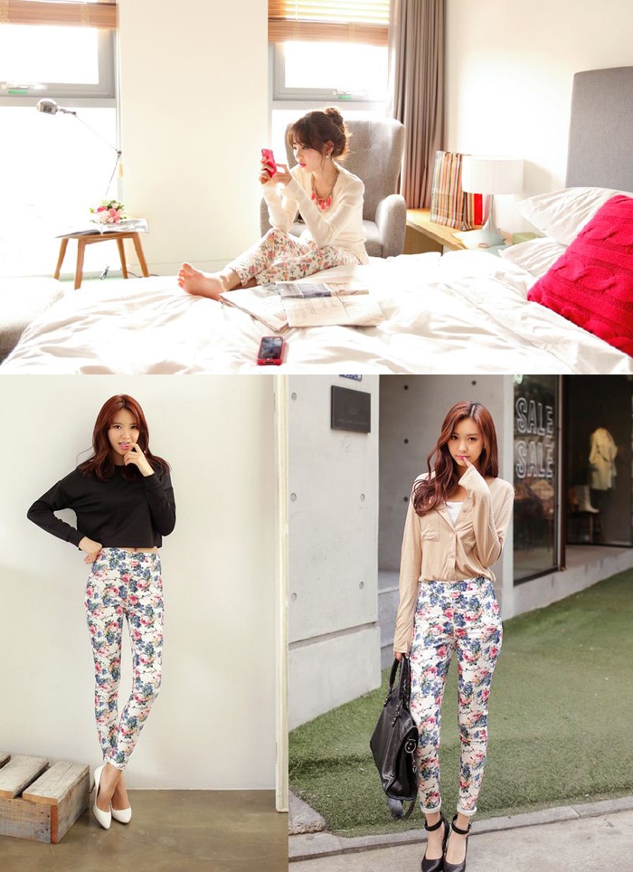 | Nếu muốn bảo vệ chân xinh khỏi nắng nóng, bạn nên chọn những chiếc quần skinny hoa, màu sắc tươi mới, nhẹ nhàng, kết hợp với các loại áo trơn màu. |