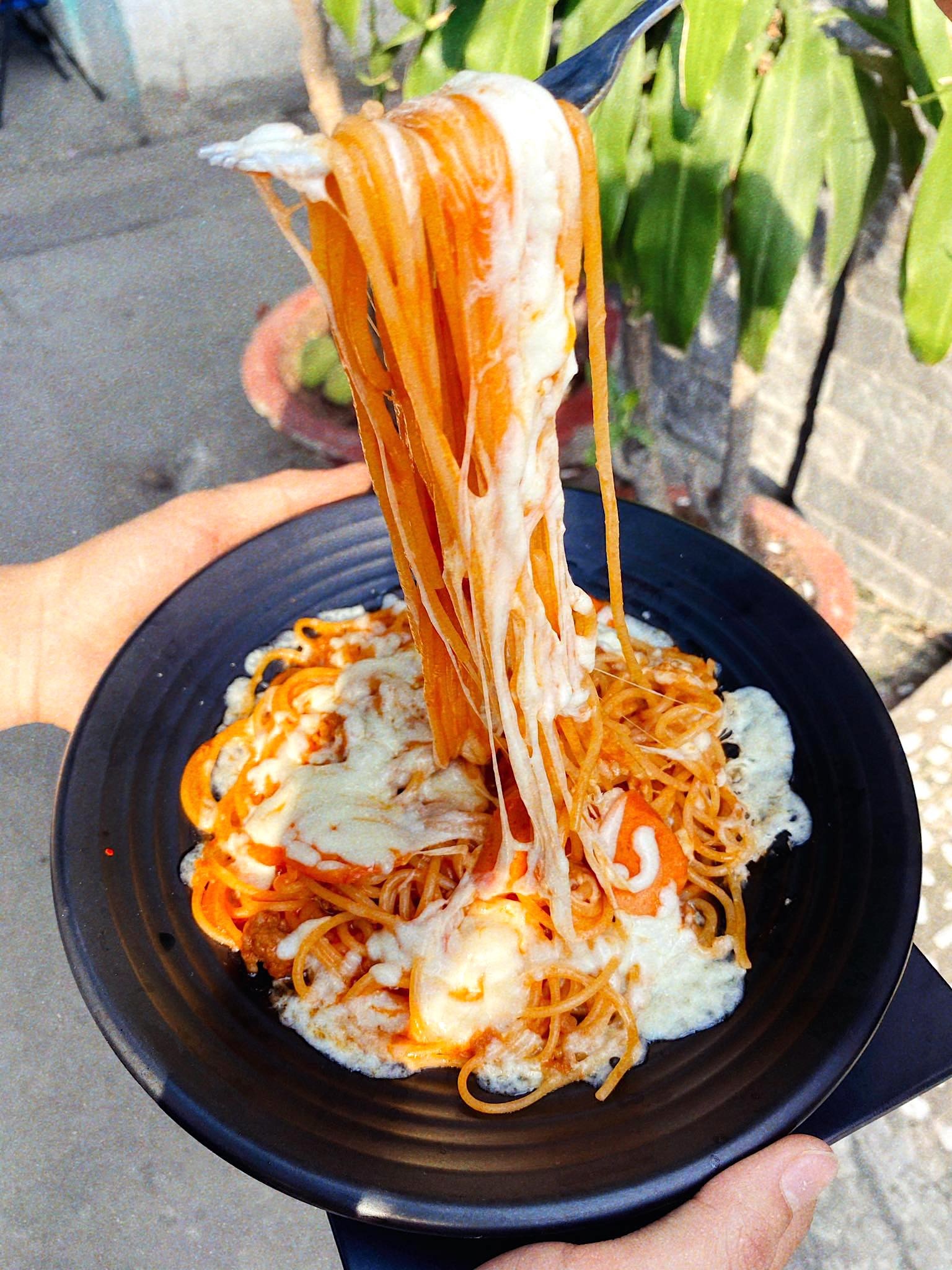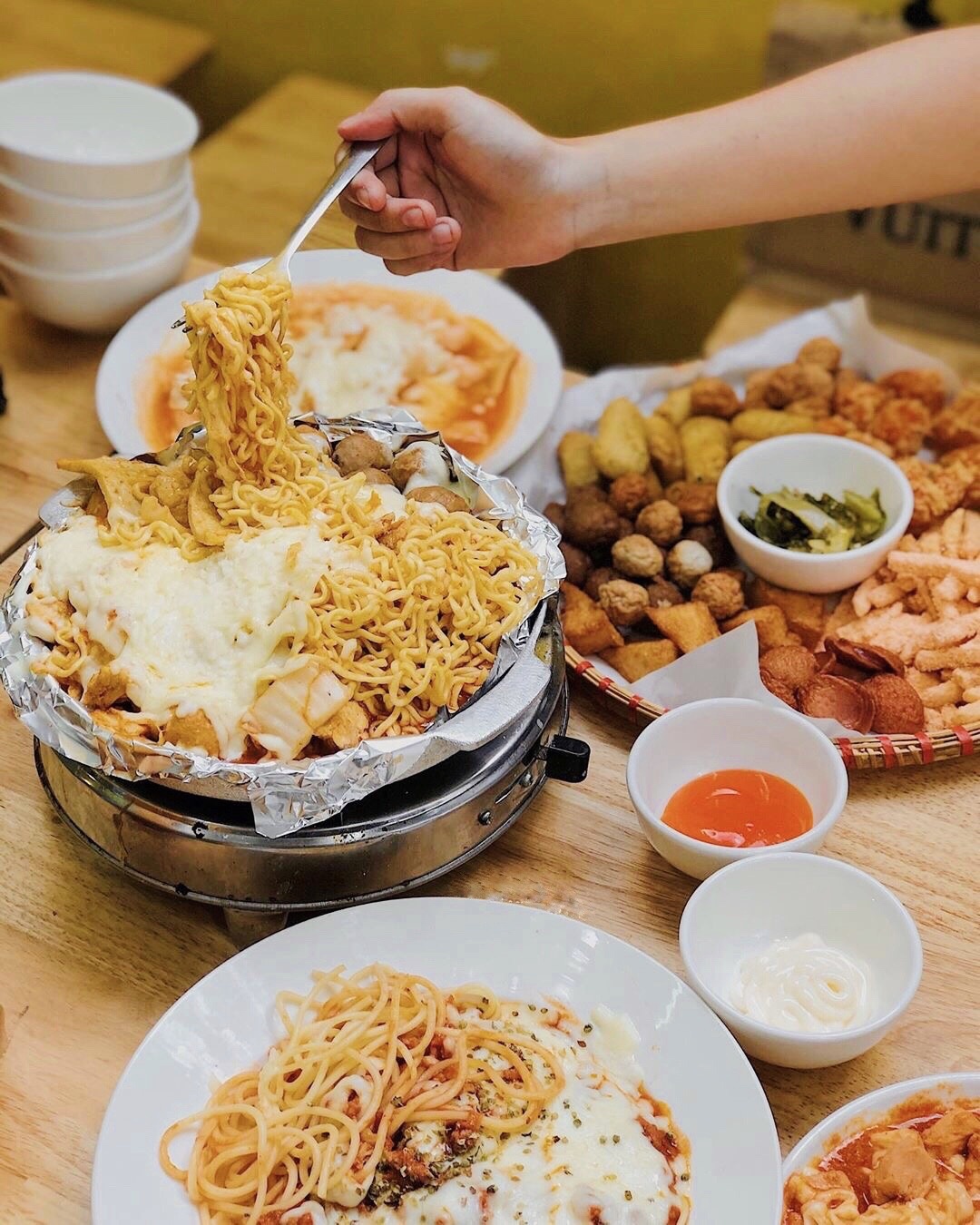 | Mì gà sốt cay: Nhà phô mai là địa điểm thu hút những tín đồ sành ăn. Loạt món hấp dẫn như gà cay, tteokbokki... tại đây đều có sự kết hợp của phô mai thơm ngon, béo ngậy. Món mì gà sốt cay được lòng thực khách với phần gà mềm, phô mai kéo sợi quyện cùng mì bùi béo. Tteokbokki gây ấn tượng với người thưởng thức bởi phần nhân chả cá Hàn Quốc, trứng cút, phô mai kèm bánh gạo dẻo mềm. Ảnh: Nhaphomaigovap. |