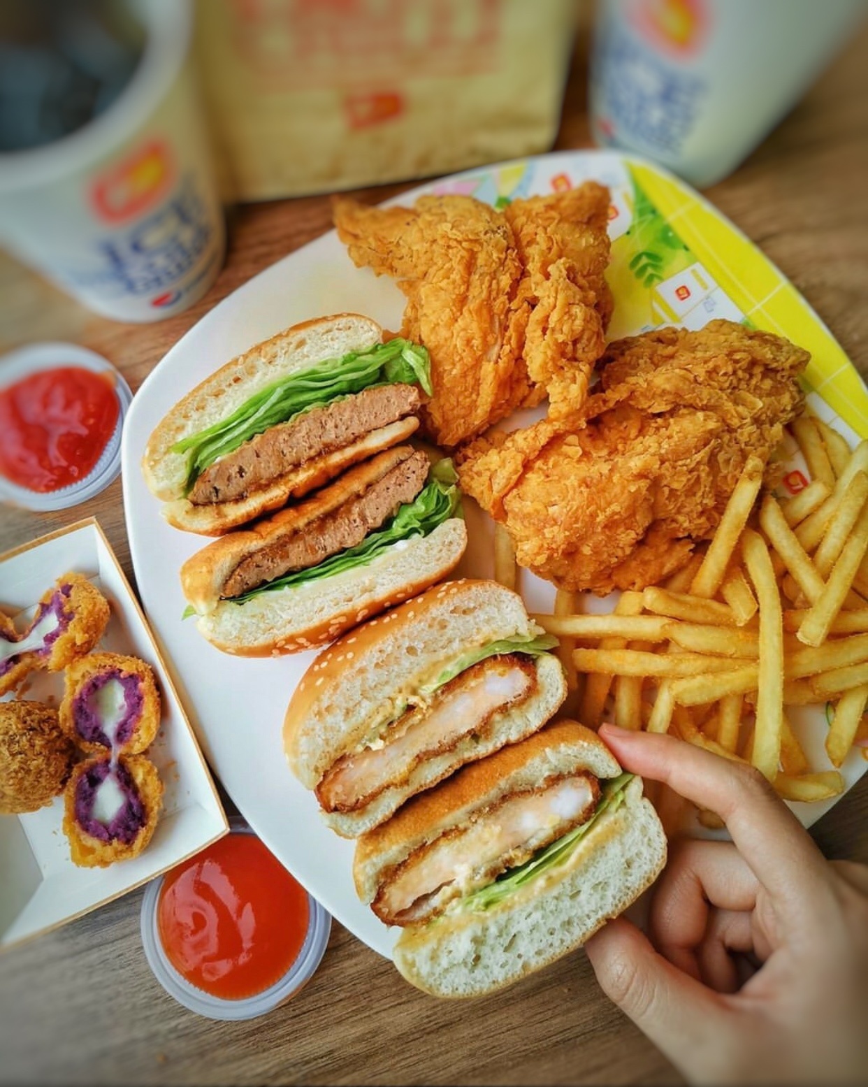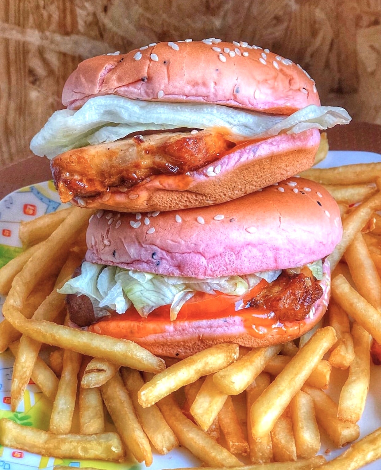 Hamburger thanh long: Bên cạnh gà rán hay bánh mì kẹp thông thường, các tín đồ của thức ăn nhanh có thể trải nghiệm thêm phiên bản hamburger thanh long lạ vị. Chiếc hamburger thu hút thực khách với lớp vỏ màu hồng bắt mắt. Bánh có lớp bột mềm mịn, nhân thịt gà thấm vị và không bị khô. Ngoài ra, phần hamburger còn có rau xà lách và tương ăn kèm mang lại hương vị thơm ngon, hấp dẫn. Bạn có thể gọi đặt món tại các cửa hàng Lotteria Việt Nam. Hiện tại, phần combo gồm 1 hamburger thanh long, khoai tây chiên và thức uống có giá chỉ 35.000 đồng. Ảnh: Linhchimm, Homnay_tuiangi. |