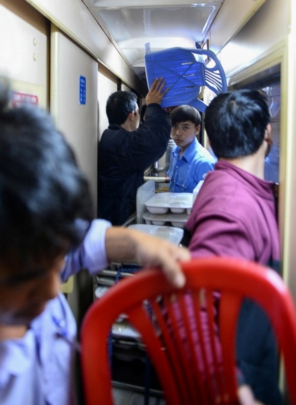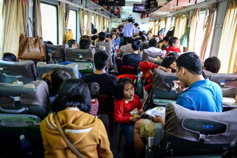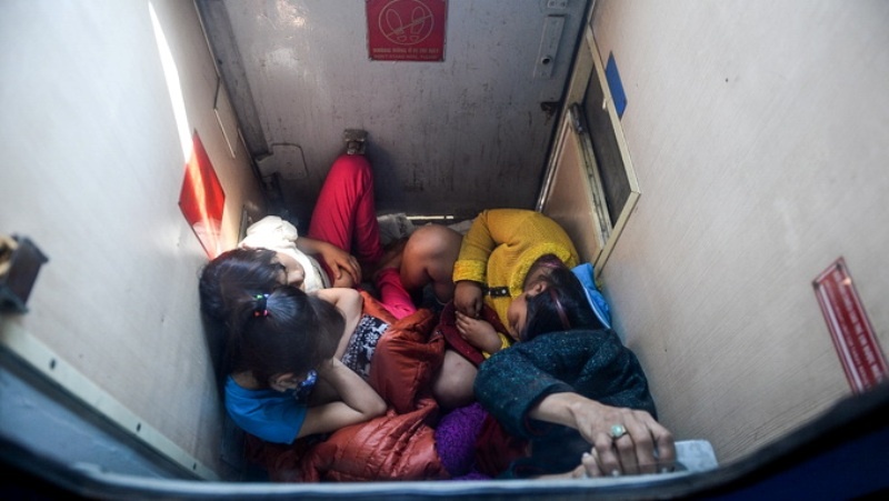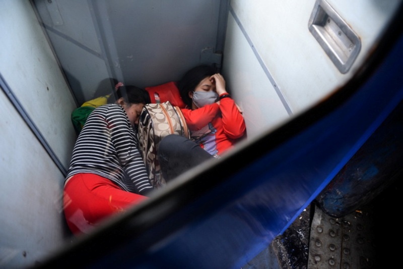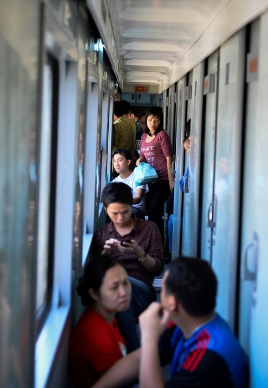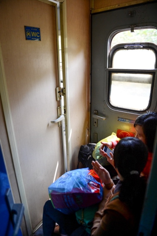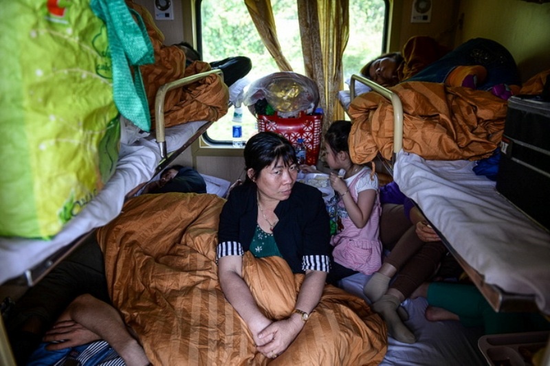 | Hành khách đứng, ngồi chật kín lối đi lại của toa giường nằm. |