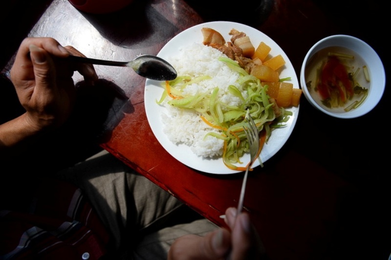 | Hành khách không biết né đi đâu để xe chở thức ăn đi qua. |