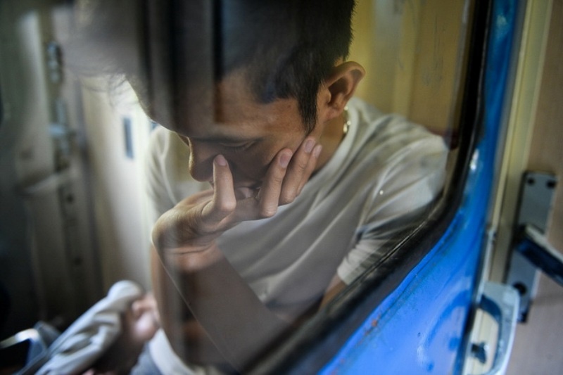| Một hành khách ngủ gà ngủ gật ở hành lang. |