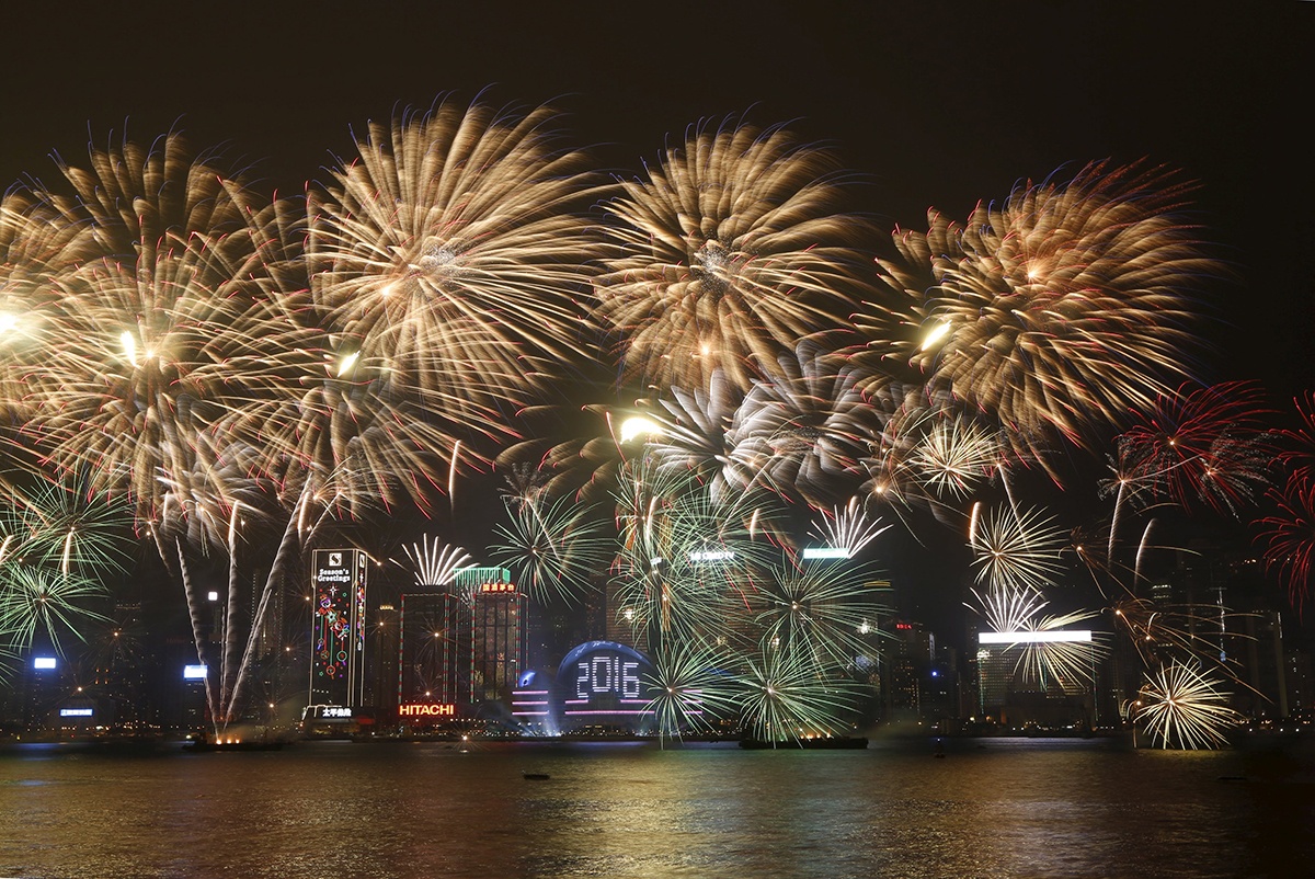 Màn trình diễn pháo hoa tại Cảng Victoria, Hong Kong, trong thời khắc giao thừa. Dù không phải ngày tết truyền thống nhưng rất nhiều người Trung Quốc vẫn đổ ra đường trong dịp tết dương lịch. Tại nhiều thành phố lớn, chính quyền Trung Quốc tổ chức bắn pháo hoa để kỷ niệm thời khắc chuyển giao giữa năm 2015 và 2016. Trong sự kiện năm ngoái, 36 người đã thiệt mạng vì giẫm đạp trong lễ đón năm mới ở Thượng Hải. Ảnh: Reuters