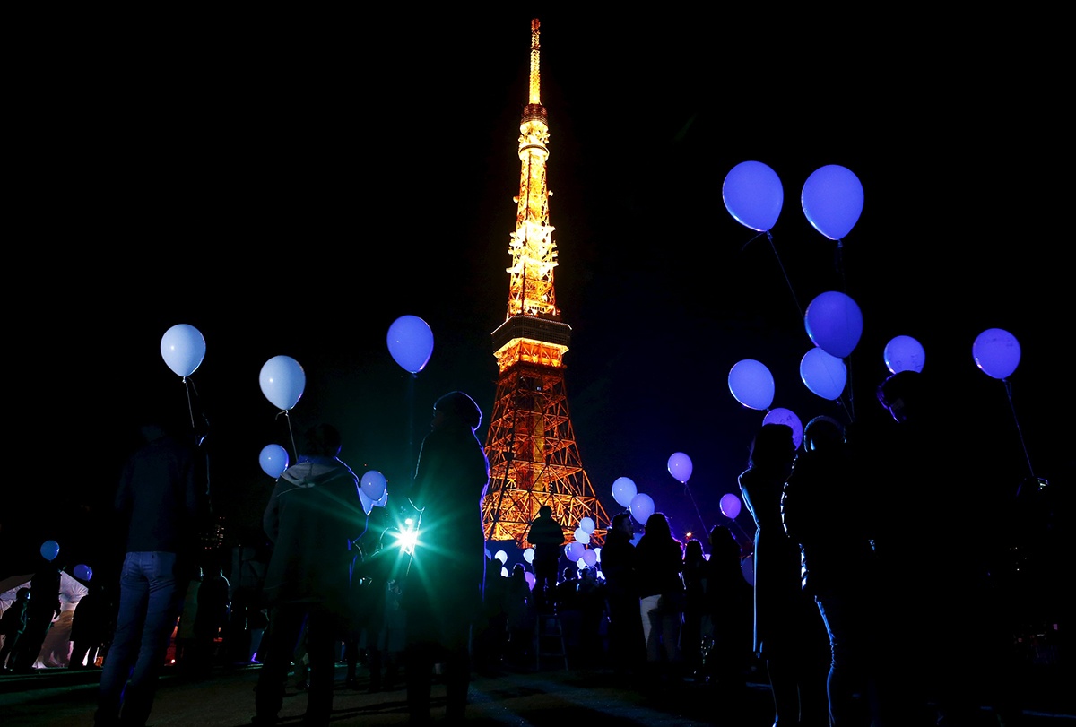 Người dân Nhật Bản thả bóng bay tại tháp Tokyo để tiễn năm 2015, đón năm mới 2016. Ở Nhật Bản, năm mới là dịp lễ lớn. Hàng triệu người vội vã rời khỏi các thành phố để về với quê nhà, nơi họ thưởng thức loại mì truyền thống tượng trưng cho tuổi thọ. Năm nay, Tokyo đón năm mới trong tình trạng báo động cao. Những tấm áp phích ở ga tàu điện ngầm và những nơi công cộng nhắc nhở người dân để mắt tới những đồ vật khả nghi. Ảnh: Reuters