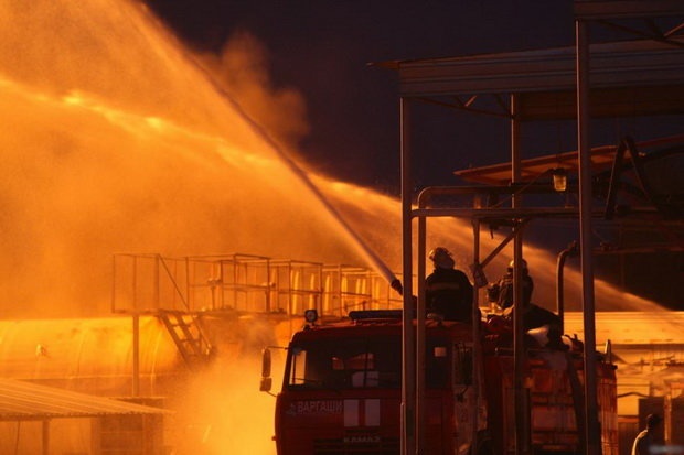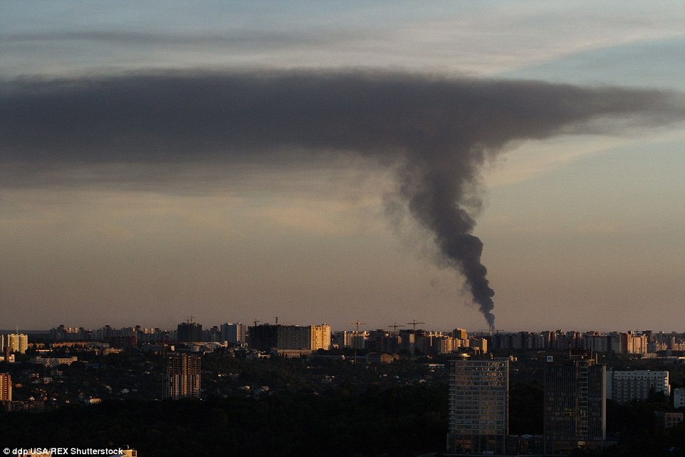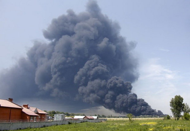 | Vụ hỏa hoạn xảy ra vào tối 8/6 khi ít nhất 9 thùng chứa nhiên liệu bốc cháy tại cơ sở chứa dầu BRSM-Nafta, cách thủ đô Kiev khoảng 30 km về phía tây nam.  |