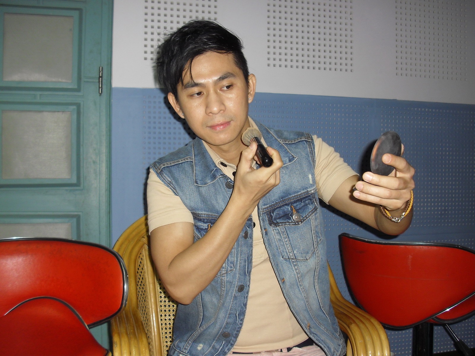 | Để lên sóng được chỉn chu và đẹp hơn, anh đã tự make-up nhẹ cho mình. |