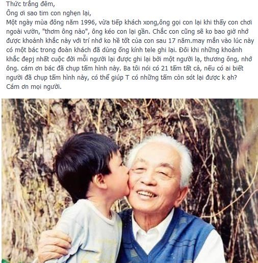 Anh viết: "Ông ơi, sao tim con nghẹn lại. Một ngày mùa đông năm 1996, vừa tiếp khách xong, ông gọi con lại khi thấy con chơi ngoài vườn, "thơm ông nào", ông kéo con lại gần hơn.