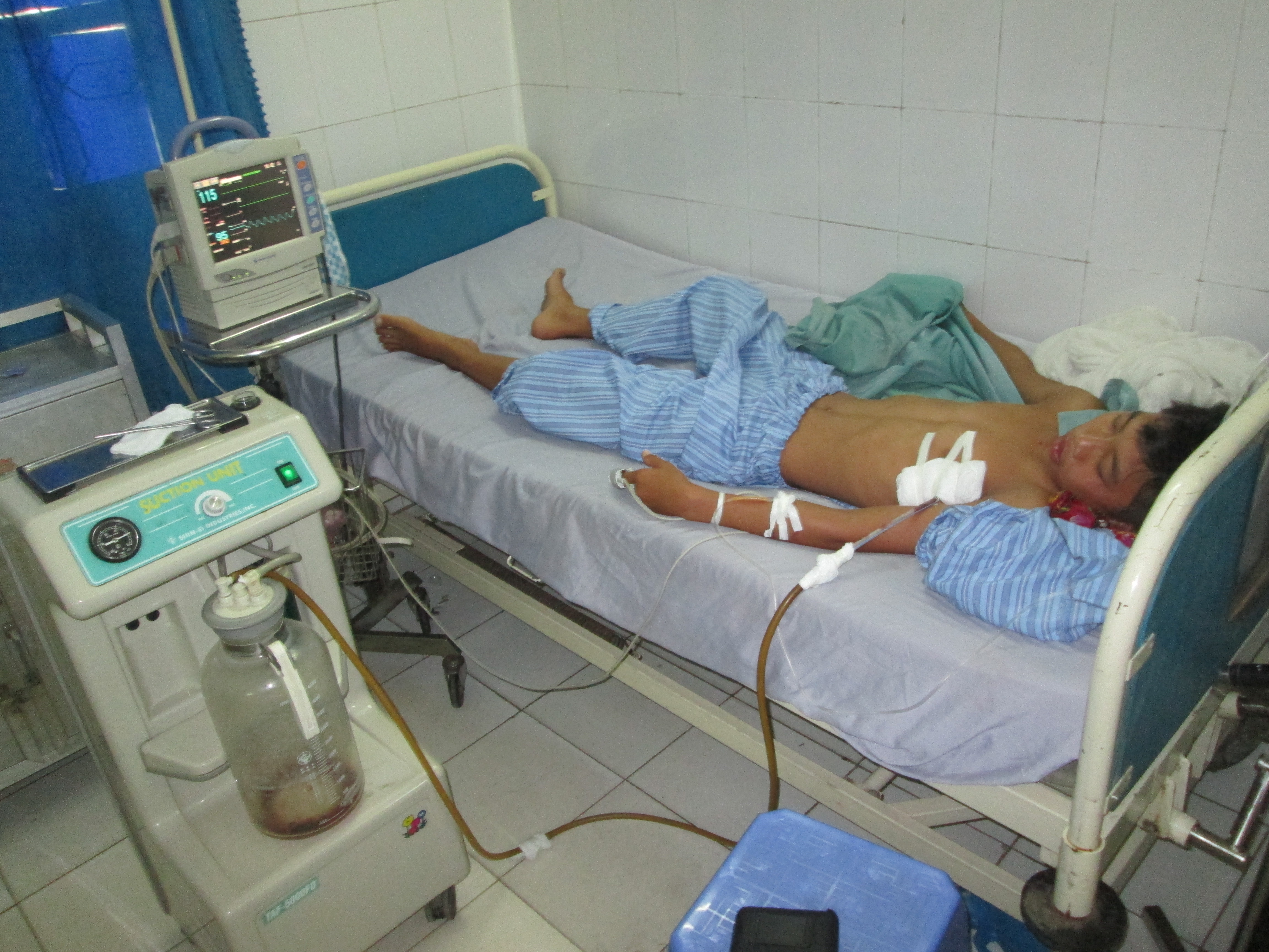 Sau khi khám và kiểm tra, bệnh viện kết luận cháu bị đa chấn thương, gãy xương sườn trái, xẹp lá phổi trái, phổi bên phải tràn dịch. Các bác sĩ điều trị đã phải tiến hành hút dịch phổi ngay nếu không sẽ gây nguy hiểm cho tính mạng.