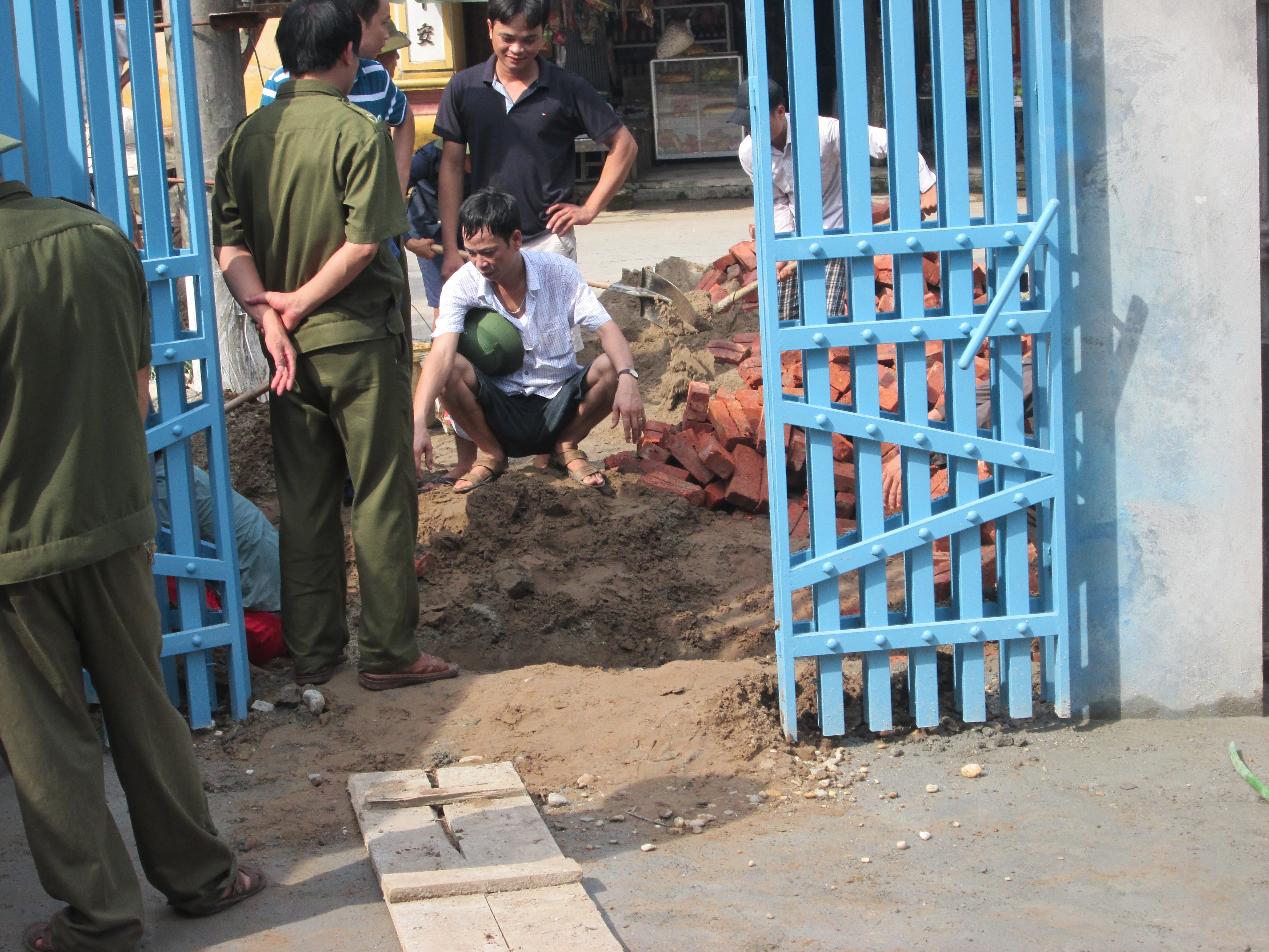 Thấy mẹ bị đánh, cháu Nguyễn Minh Hiếu từ trong nhà chạy ra đưa mẹ vào nhà thì bị ông B. dùng xẻng đánh khiến cháu Hiếu gục ngã xuống nền cổng.