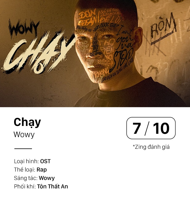 Như một sự tương hợp, Chạy cũng là tên của ca khúc nhạc phim do Wowy sáng tác và thể hiện. Một bản rap dồn dập tiếng trống, trong diện mạo của những ca từ chân thực và đường phố nhất, được cho là không thể phù hợp hơn với tác phẩm điện ảnh đầu tay của Trần Thanh Huy.