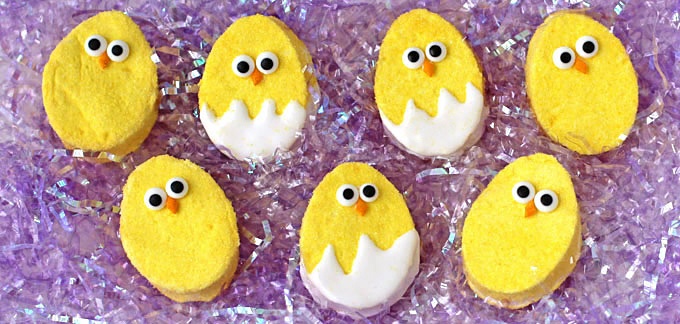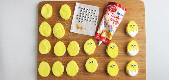 | Bước 8: Bây giờ hãy bắt tay trang trí để những quả trứng vàng này trông giống như những chú gà con đáng yêu. Đầu tiên là đính hai viên kẹo hình đôi mắt lên để tạo thành 2 con mắt tròn xoe cho chú gà con. Dùng kem trang trí phần dưới viên kẹo thành hình quả trứng nứt ra chú gà con như trong hình. |