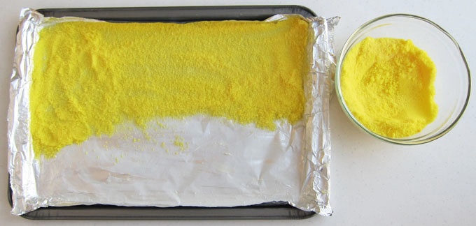 | Cách làm: Bước 1: Chuẩn bị một cái khay có kích thước khoảng 35cm x 20cm hoặc lớn hơn. Trải giấy bạc lên khay và thoa đều 1 lớp bơ lên trên giấy bạc. Cho 1/2 chén đường vàng lên khỏa đều. |