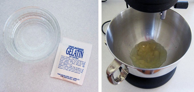 | Bước 2: Ngâm bột Gelatin trong nước lạnh 5 phút, rồi cho vào trong máy trộn. |