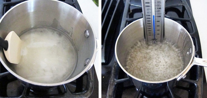 | Bước 3: Cho hết đường cát trắng, xi rô bắp, nước và muối vào trong nồi khuấy tan, đậy nắp và đun sôi đến khi nhiệt độ đạt khoảng 115 ºC. |