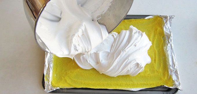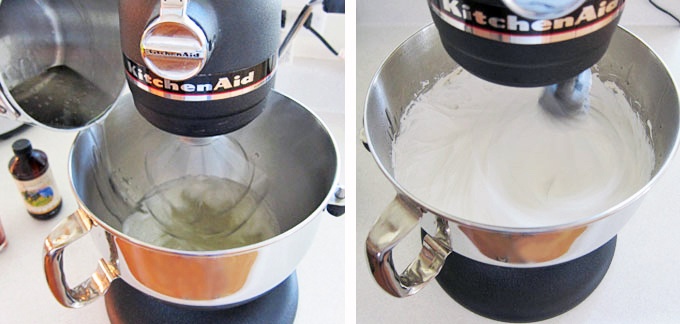 | Bước 4: Cho phần si-rô đã nấu chín từ từ vào trong máy trộn đang chứa bột Gelatin. Để tránh bị bỏng do bột từ máy trộn bắn lên, bạn nên thao tác cẩn thận và nhớ mang găng tay làm bếp trong quá trình chế biến. Bạn nên bật máy trộn từ 1-2 phút. Sau đó tắt và để nguội trong vòng 10- 15 phút. Khi bột đã đạt tới độ quánh thì cho hương vani vào. |