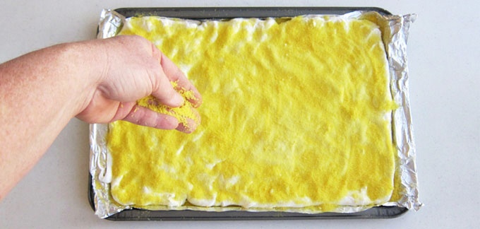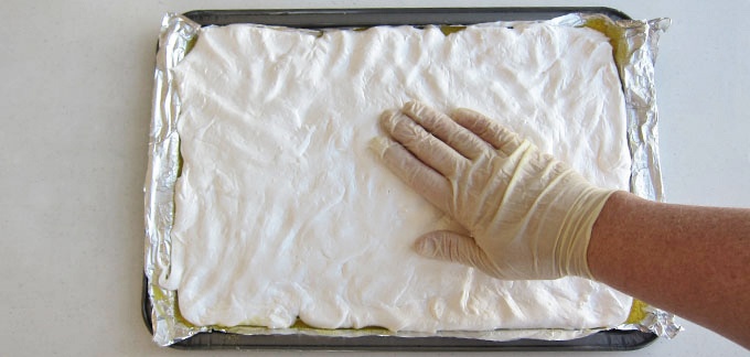 | Bước 5: Đổ hỗn hợp này lên khay đã chuẩn bị sẵn và dùng tay khỏa đều ra. Để găng tay không dính bột, nên thoa 1 ít bơ lên phần găng tay tiếp xúc với bột. |