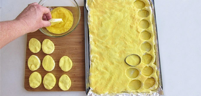 | Bước 7: Dùng một chiếc khuôn hình oval để cắt kẹo. Trước khi cắt, nhúng khuôn vào trong đường vàng để kẹo không bị dính vào khuôn. Lấy kẹo ra, phết thêm đường vàng lên đều khắp viên kẹo. |
