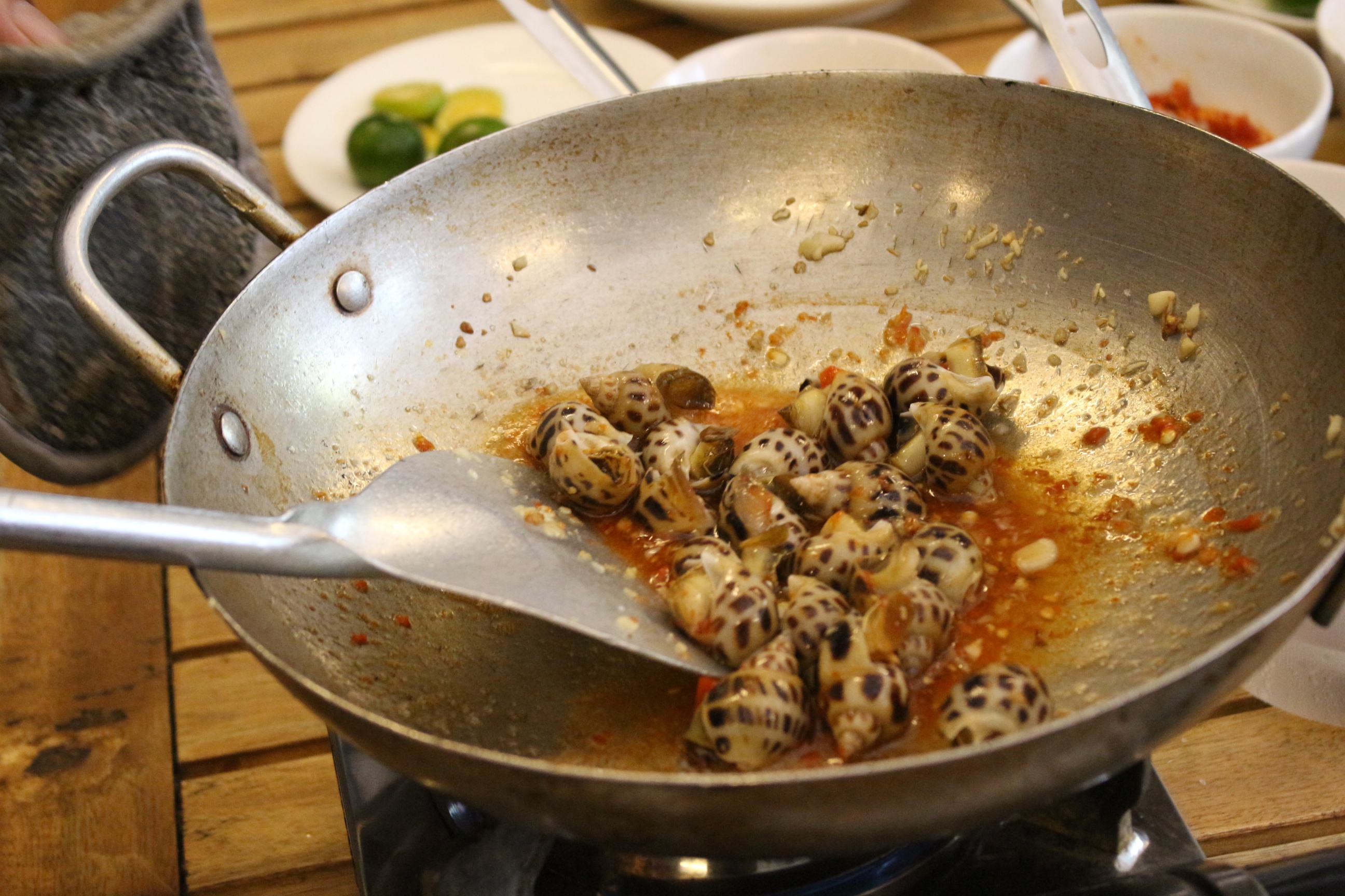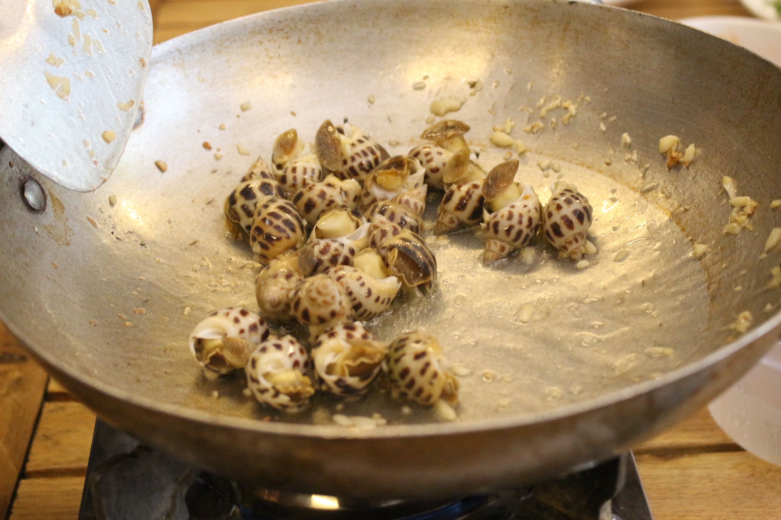 Khi tỏi cháy vàng, cho ốc hương vào, xào đều tay.