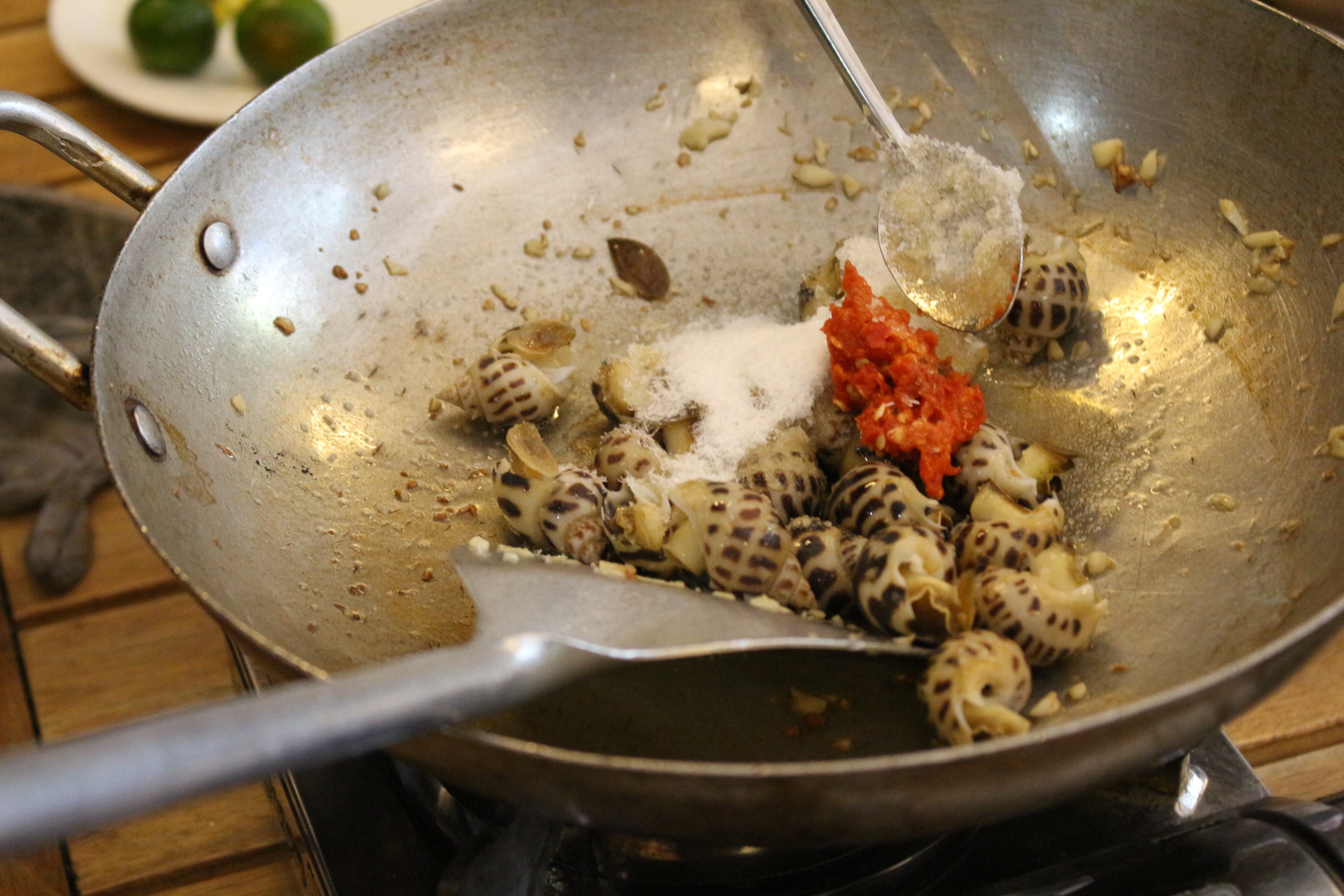 Đảo đều ốc với gia vị khoảng 2 phút thì cho nước cốt tắc vào.