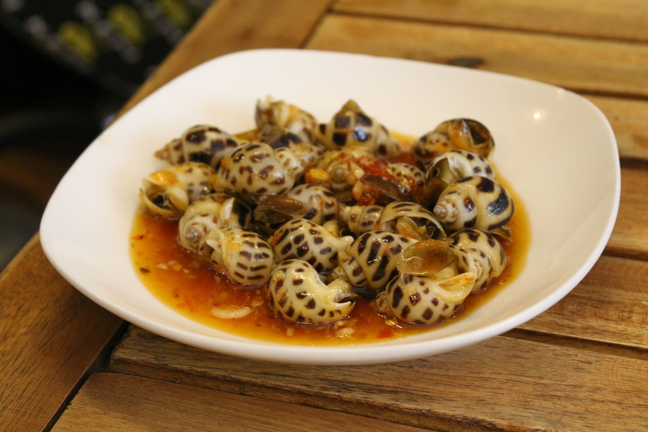 Trang trí đĩa ốc với tắc xắt mỏng. Bạn có thể chấm ốc cùng nước sốt, ăn kèm bánh mì. |