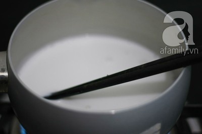 | Cho 200ml nước cốt dừa vào nồi, thêm 5 thìa cà phê đường, 2 thìa cà phê bột năng vào khuấy đều ( tùy vào khẩu vị ăn ngọt của từng người nhé). Vừa đun, vừa khuấy đến khi nước cốt dừa sánh đăc. |
