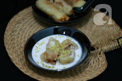 | Thái chuối thành từng khoanh nhỏ vừa ăn, cho vào bát, chan nước cốt dừa và rắc cốm lên trên rồi thưởng thức. |