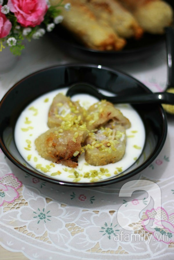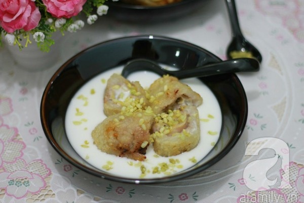 Món chè chuối cốm này nên ăn nóng, nước cốt dừa cũng được giữ ấm để khi ăn bạn có thể cảm nhận được vị giòn thơm của chuối nếp khi vừa nướng xong và vị giòn tan của cốm xanh chiên vàng.