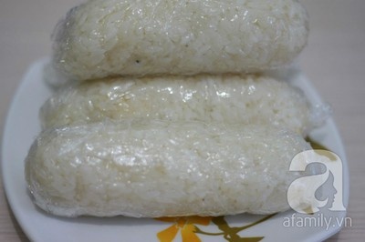 | Trải 1 tấm màng bọc thực phẩm, cho cơm nếp vào dàn mỏng đều. |