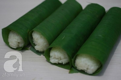 | Trải từng miếng lá chuối đã rửa sạch, cho từng quả chuối đã bọc nếp lên, gói lại. |