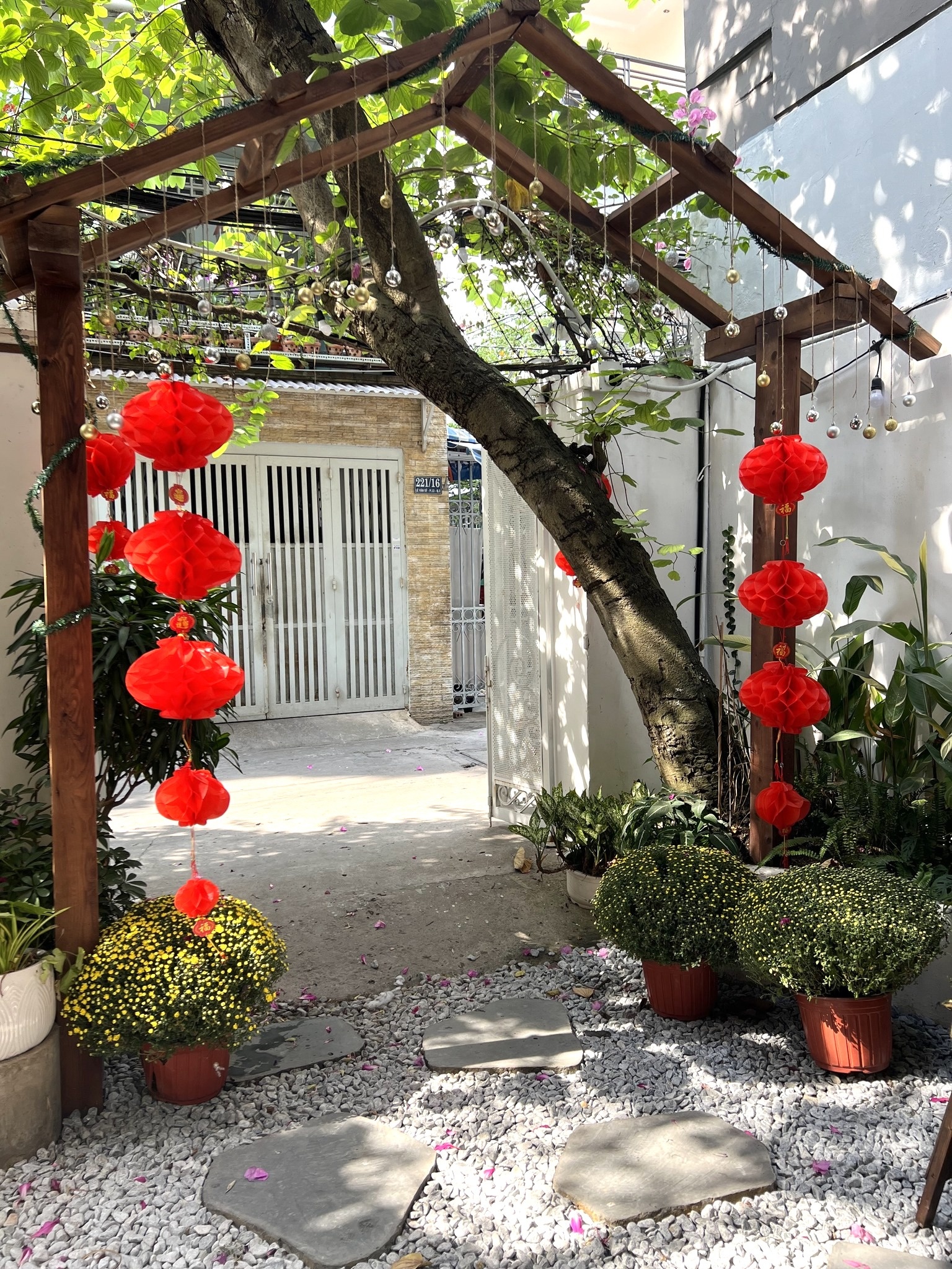 Không gian ở Tân Bình, rực rỡ với những chậu hoa tươi, bao lì xì ngay từ lối ra vào. Các đạo cụ, phông nền đậm chất Tết cho giới trẻ thỏa sức check-in.